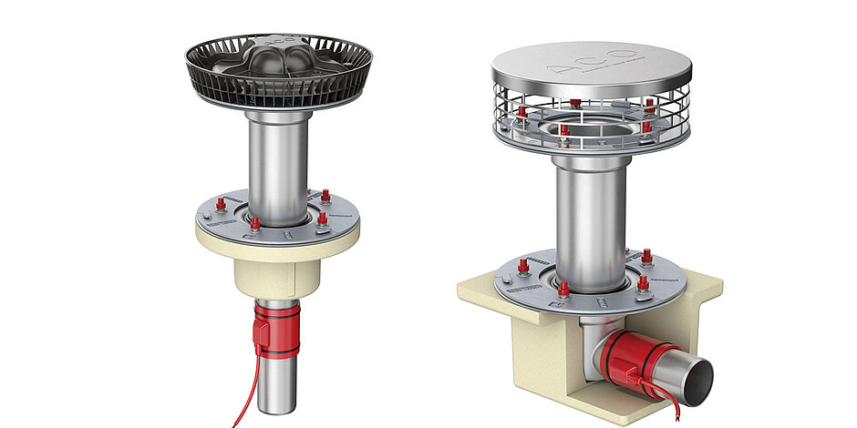 Flachdachabläufe in den Nennweiten DN 50 bis DN 100 mit Stutzenneigung 90° benötigen eine Kernbohrung von nur 160 mm inkl. Isolierung. Die Vereinheitlichung des Flachdachablaufs bringt eine Reduzierung der Sortimentsteile mit sich, was wiederum die Planung und Installation vereinfacht. Eine verringerte Anzahl an Flanschbolzen beschleunigt die Montage. Der Kiesfang zur Freispiegelentwässerung sowie die Luftschleuse für die Unterdruckentwässerung lassen sich durch eine Drehbewegung werkzeuglos auf dem Alu-Druckgussflansch verriegeln.