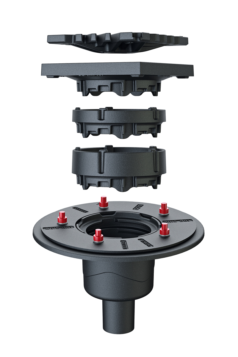 Der neue Festflansch kommt laut Hersteller ohne Gewindetaschen aus und macht die dafür erforderlichen Aussparungen überflüssig. Die Kernlochbohrungen fallen mit Ø 160 mm (DN 50, inkl. Isolierkörper) bzw. Ø 220 mm (DN 80, inkl. Isolierkörper) sehr klein aus. Der Isolierkörper aus PUR für den Flachdachablauf ist rund statt bislang achteckig, was den Zuschnitt der Öffnung bzw. die Einbringung erheblich vereinfache. Der neue Bauzeitenschutzdeckel hält laut ACO Belastungen bis 200 kg statt bislang 20 kg stand. Eine vereinfachte Montage verspricht ein Lippendichtring, der den bisherigen Einsatz von Rollringen bei der Nennweite DN 80 ablöst. Statt je einem Aufsatzring pro Nenngröße mit fest definiertem Höhenzugewinn gibt es jetzt zwei stapelbare Ringe, die eine stufenweisen Anpassung um 5 mm im Bereich von mindesten 25 bis maximal 60 mm ermöglichen. Die neuen Roste (200 x 200 bzw. Ø 200 mm für DN 50, 300 x 300 m für DN 80) haben eine Schlitzbreite von 10 mm, erfüllen die Anforderungen der Belastungsklasse M125 und können sowohl gelegt als auch verschraubt werden. J