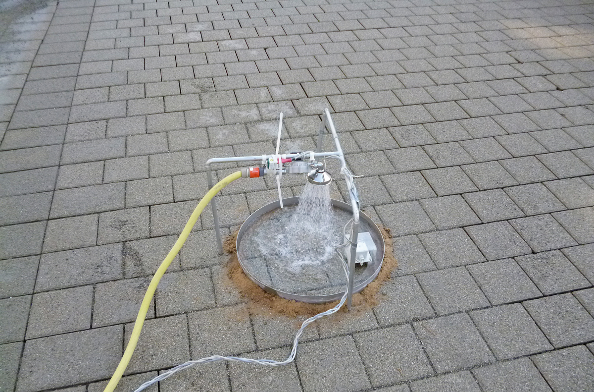 Bleiben derart befestigte Flächen aber auch dauerhaft wasserdurchlässig? Kritiker behaupten, dass durch Verschmutzungen schon nach kurzer Zeit keine Versickerung mehr möglich sei. Hierzu Heider Auner: »Selbst bei etwaig stärkeren Verschmutzungen der Oberfläche kann die Wasserdurchlässigkeit der Pflastersteine durch ein Spül-Saugverfahren komplett wiederhergestellt werden. Eine wichtige Voraussetzung für eine dauerhafte Versickerungsleistung ist aber, dass der Oberbau unter dem Pflaster wasserdurchlässig ist. Hier wird oft der Fehler gemacht, dass in die Tragschichten zu viele Feinanteile eingebracht werden. So führt z. B. ein hoher Kalkanteil dazu, dass sich die Tragschichten schnell verdichten und Wasser kaum noch versickern kann. Statt der oft realisierten Schottertragschicht in einer Korngröße von 0/45 mm sollte daher besser auf ein Material in einer Körnung von 2 / 45 mm gesetzt werden, was nach ZTV SoB-StB 20 auch zulässig ist. Je nach Belastungssituation und Untergrund bietet es sich an, darüber eine Tragschicht aus Drainbeton oder Drainasphalt aufzubringen«, so Auner. Auch das Bettungs- und Fugenmaterial hat einen wichtigen Einfluss auf die dauerhafte Wasserdurchlässigkeit derartig befestigter Pflasterflächen. Auner empfiehlt einen kalkfreien 2 / 5er oder 2 / 8er Porphyr- oder Basaltsplitt mit einem SZ-Wert unter 18.