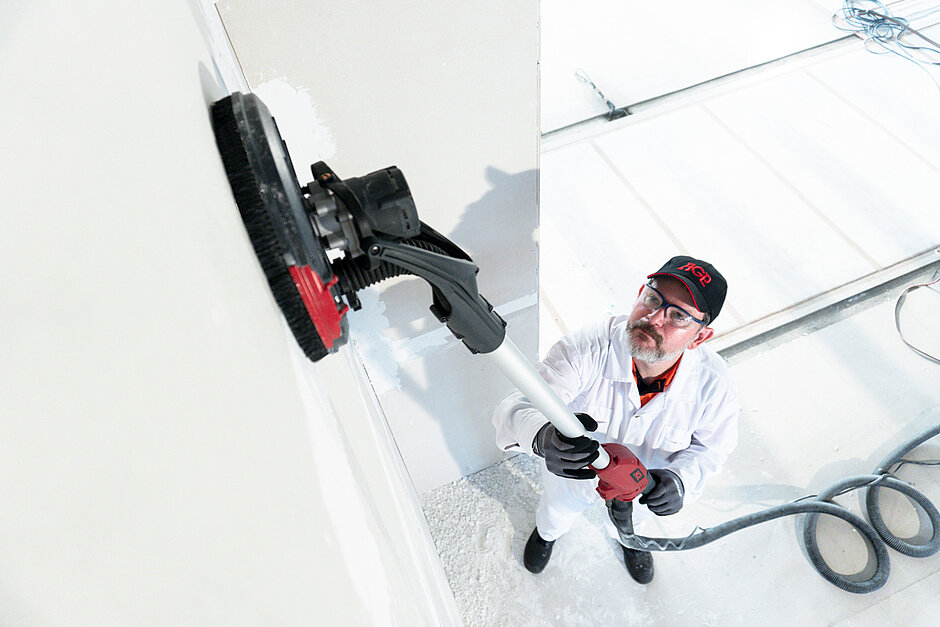 Trockenbauwände sind nach wie vor die erste Wahl für Handwerker im Innenbereich. Nachdem die Trockenbauplatten angebracht wurden, folgt das Verspachteln und Verputzen der Nähte. In der Regel werden mindestens drei Schichten Spachtelmasse aufgetragen, nach jeder Schicht muss geschliffen werden. Jahrelang wurde dieser Schleifprozess manuell mit einem Stangenschleifer durchgeführt – eine arbeitsintensive, staubige und mühsame Aufgabe. Mittlerweile kommt häufig ein elektrischer Trockenbauschleifer mit einer flexiblen Antriebswelle zum Einsatz.