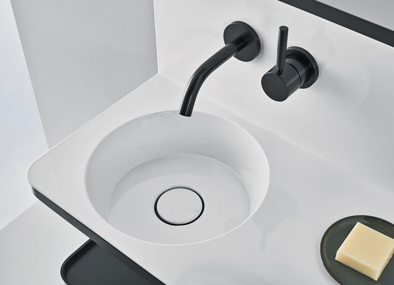Die Produktneuheit wartet mit vielen Details wie exakte Flächen, kleine Radien und fein aufeinander abgestimmte Proportionen der einzelnen Komponenten auf. Funktion und Design im Einklang. »Steel19« besteht aus einer kompletten Einheit mit der Wandauslaufarmatur, die schnell und mit geringem Aufwand montiert werden kann: Der Unterputzkörper ist hinter der Rückwand und der Siphonverkleidung vormontiert, bauseits müssen daher nur die Wandbefestigung und der Anschluss an die Eckventile vorgenommen werden. Waschtischabdeckung und Rückwand sind aus glasiertem Stahl, die nahtlos integrierte Beckenmulde mit flächenbündiger Ventilklappe ist weiß emailliert. Der Rahmen und die Siphonverkleidung sind mattschwarz pulverbeschichtet. Das filigrane schwarze Gestell bietet einen starken Kontrast zu dem weißen Becken und der emaillierten Rückenwand. Zusammen unterstreichen sie die industrielle Anmut des Waschplatzes.
