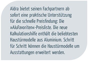 Von der Aktionshaustür bis zum exklusiven Haustürmodell: Um das ansprechende Design der Haustüren aus Aluminium zu betonen und gleichzeitig einen größtmöglichen Lichteinfall für einen schönen Eingangsbereich zu ermöglichen, wurde die Konstruktion von Elementen mit Seitenteil optimiert. »Dank schmaler Profilansichten ohne Konterstück im Seitenteil werden moderne Haustüren aus Aluminium zu einzigartigen Eingängen in den persönlichen Raum«, so Aldra abschließend.