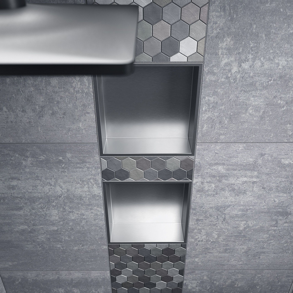 Eine besondere Herausforderung an die Gestaltung im Bad stellen häufig die Ablagemöglichkeiten dar. Die alferbox-Serie von alferpro soll dieses Segment aufwerten und die Nische nicht nur zu einer praktischen Ablagemöglichkeit, sondern auch zu einem Designhighlight machen. Mit dem bereits vorgefertigten alferbox Wandelement lassen sich im Bad im Handumdrehen puristisch elegante Stellflächen schaffen. Die Boxen sind als komplett vorgefertigte Wandelemente aus hochwertigem Edelstahl erhältlich, so können sie ohne aufwendige Montagearbeiten direkt in der Wand angebracht werden. Mithilfe einer passenden Dichtmanschette und mit einem dezenten Rundum-Ablaufgefälle versehen, sollen passgenaue und gut geschützte Übergänge entstehen, sodass für ein dauerhaft schönes Erscheinungsbild gesorgt sei.