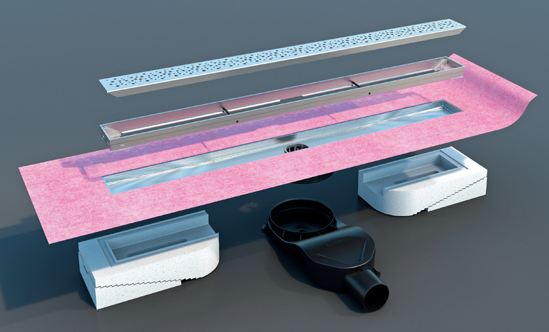 Mit »Alferline Slim Plus« hat Alferpro ein Duschrinnensystem für besonders niedrige Einbauhöhen entwickelt – mit 60 mm Gesamtaufbauhöhe eignet es sich für Neubauten und für Sanierungen. Durch den EPS-Hartschaumblock wird das System auf dem Untergrund ohne zusätzliche Unterfütterung positioniert, wie Alferpro betont. Mit dem zweiteiligen Unterbau kann die Aufbauhöhe von 60 mm bis 80 mm frei variiert werden – durch die gleitenden Längen ist kein Rahmeneinbau notwendig. Dank des EPS-Blocks reduzieren sich Wasseraufprall- und Ablaufgeräusche. Auch ein Abfluss mit Geruchsverschluss ist integriert.