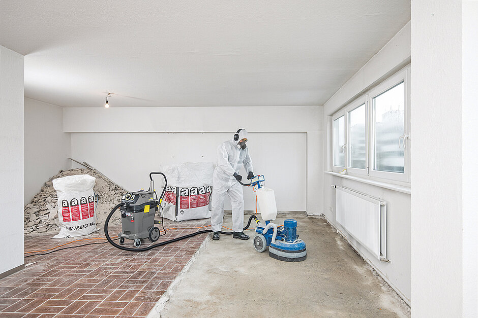 Ob in Werkstätten oder auf Baustellen – hat sich der Baustaub über Nacht am Boden abgesetzt, sollte am nächsten Tag gründlich gereinigt werden. Bodenflächen können mithilfe von Kehrmaschinen von Staub befreit werden. Für die Reinigung von Flächen ab 200 m² empfiehlt sich der Einsatz von handgeführten Kehrsaugmaschinen. Sehr große Flächen können mit Aufsitzkehrsaugmaschinen in kurzer Zeit und ohne Ermüdung gereinigt werden. Dank der Kehrwalzen lässt sich mit ihnen in kürzester Zeit eine große Menge an Baustaub und anderem Schmutz beseitigen. Einen entscheidenden Einfluss auf das Ergebnis hat die Art der Beborstung. Die bestmögliche Aufnahme von Feinstaub bieten Maschinen mit einer weichen Hauptkehrwalze, deren Beborstung sehr fein und dicht ist, besonders bei glatten Böden im Innenbereich.