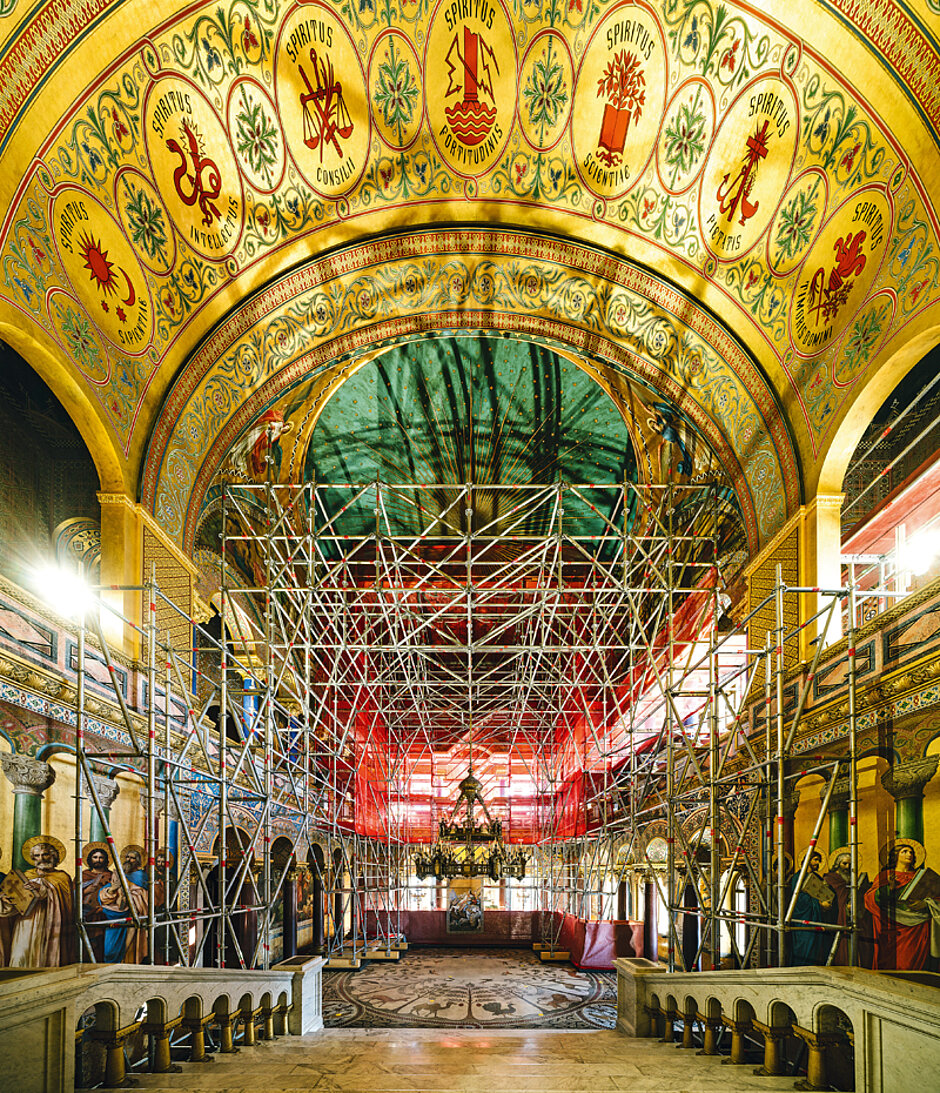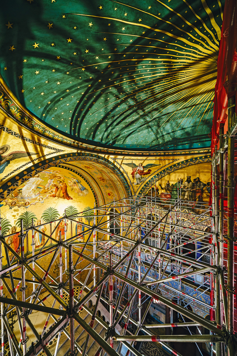 Bereits im ersten Bauabschnitt wurde der Sängersaal von Fleck Gerüstbau eingerüstet und koordiniert. Auch für den zweiten Bauabschnitt des größten Saals Neuschwansteins, den Thronsaal, setzte man auf den spezialisierten Koblenzer Gerüstbaupartner. Unter der Leitung von Bauingenieur Andreas Dölz hat Marcus Hardt, Gerüstbaumeister bei Fleck Gerüstbau, mit einem dreiköpfigen Team in drei Wochen die hohen Anforderungen an die Gerüstkonstruktion des 20 m langen, 12 m breiten und 14 m hohen Thronsaals sicher umgesetzt.