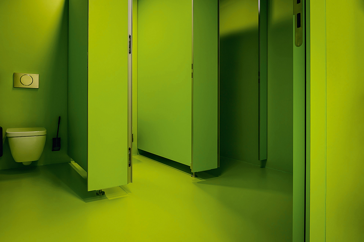 Um dieses Ergebnis abschließend sicher zu versiegeln, kam die »PU7320« Versiegelung zum Einsatz. Sie ist transparent und verschleißfest und bietet, in Kombination mit der »PU7750« Versiegelung als erste Schicht, Schutz für hochfrequentierte Bereiche. Zusätzlich verleiht sie dem Boden eine seidenmatte Optik. Die sanitären Anlagen sowie Ankleiden wurden dagegen mit auffälligen und knalligen Farben beschichtet. Hierzu lieferte der Hersteller mit dem Designkonzept der »Color Collection 3.0« die Lösung. Durch das breite Spektrum an Trendfarben für jeden Einrichtungsstil sowie der Möglichkeit, in allen RAL-, NCS- und Sikkens-Farben zu produzieren, bieten sich hier nahezu unbegrenzte Gestaltungsmöglichkeiten.