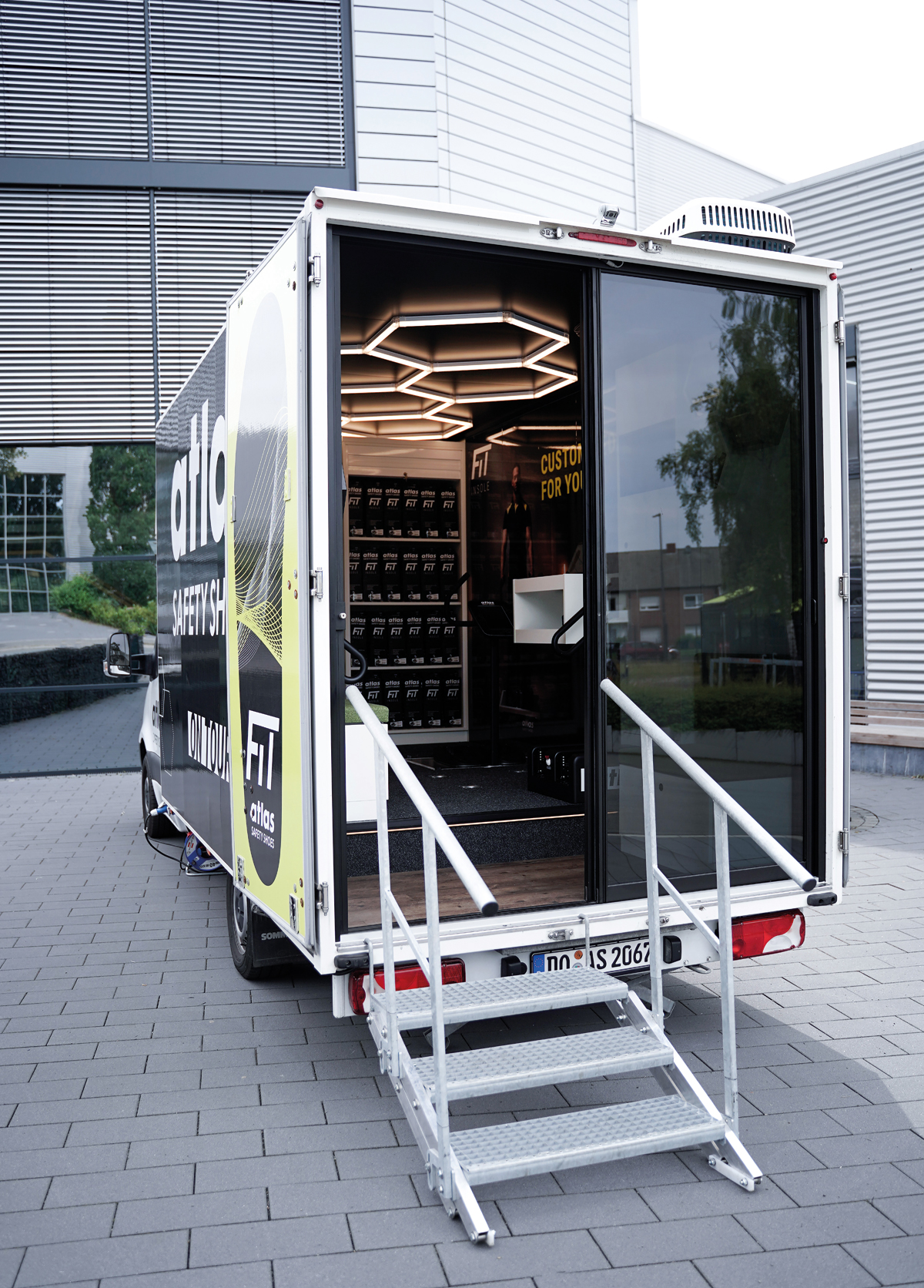 Neben einer breiten Palette an Sicherheitsschuhen bietet Atlas auch zahlreiche Dienstleistungen rund um das Thema Fußgesundheit an. So hat das Unternehmen im Jahr 2015 beispielsweise als erster Hersteller von Sicherheitsschuhen eine eigene App auf den Markt gebracht, mit der die Füße mit dem Smartphone gescannt und digital vermessen werden können. Mithilfe dieser Daten lassen sich die exakte Schuhgröße und -weite bestimmen. In diesem Zusammenhang hat Atlas die »Fit-Days« ins Leben gerufen: Das Konzept verfolgt den Inhalt einer ganzheitlichen und individuellen Fußberatung, die direkt vor Ort beim Kunden stattfindet. »Das kommt sehr gut an«, so Hendrik Schabsky im Gespräch. »In die Gesundheit der Mitarbeiter zu investieren, ist in Zeiten des Fachkräftemangels wichtiger denn je. Daher wollen wir unseren Kunden ein ganzheitliches Konzept anbieten.«