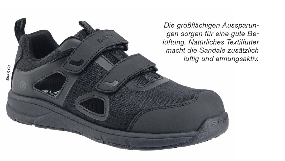 Mit Blick auf die kommenden Monate und die oftmals sehr hohen Temperaturen im Sommer präsentiert Schuhhersteller Baak die neue Sicherheitssandale »Sun«. Das Modell der Schutzklasse S1P gehört zur Serie »Baak Street Go&Relax«.