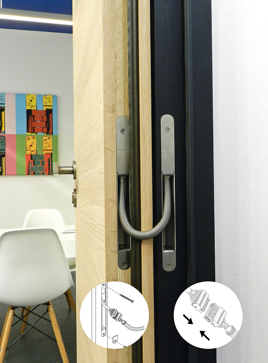 Bei »Pivota Connect« führt ein 8-adriges, von einer Spirale geschütztes Kabel vom Türblatt zur Zarge. Damit lässt sich u. a. bei geschlossener Tür anzeigen, ob ein Raum frei oder belegt ist oder es lassen sich Türen mit automatischer oder motorischer Unterstützung öffnen und schließen.