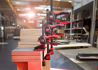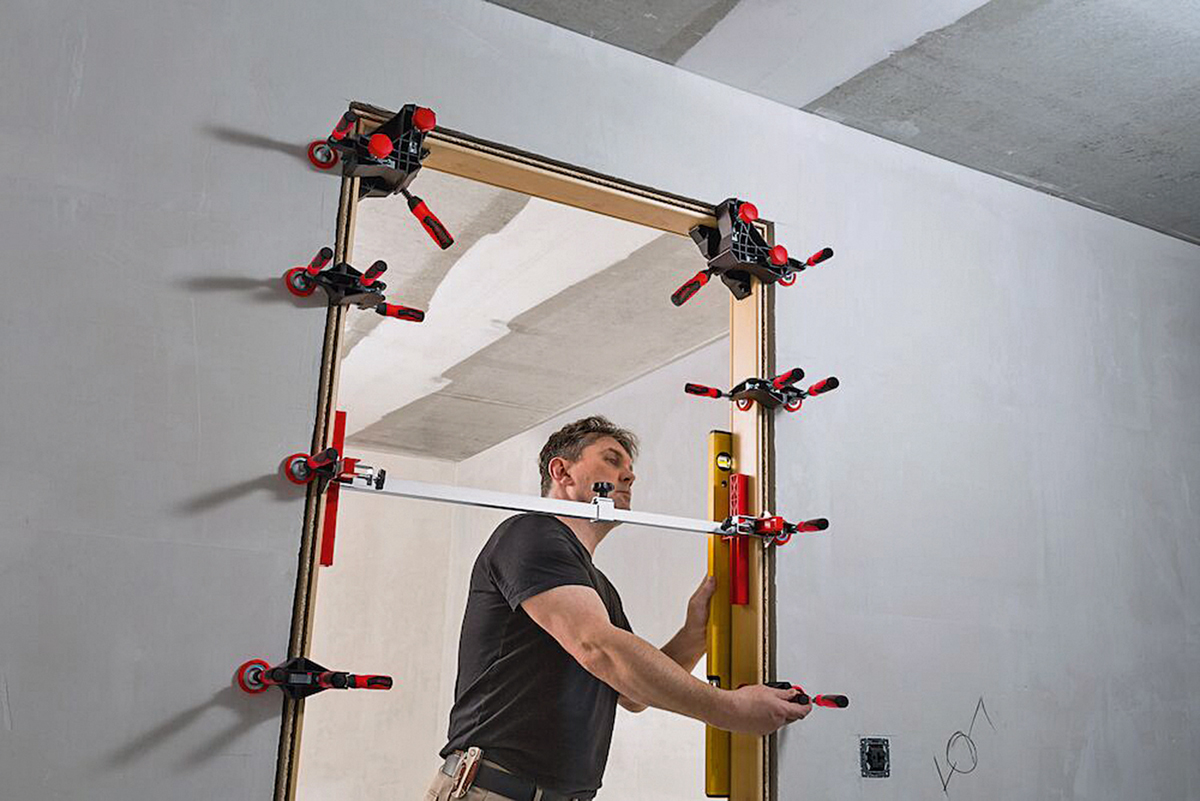 Bei der Feinjustierung des Türfutters unterstützt die Türfutter-Richtzwinge »TFM-2K« perfekt. Sie erlaubt das schonende Verschieben des fixierten Türfutters, ohne dabei Zierfutternut oder bereits tapezierte Wände zu beschädigen. Die Winkel-Türfutter-Richtzwinge »WTR« schont dagegen die Türfutterecken. Mit ihrer Hilfe lassen sich Türfutter horizontal und vertikal exakt im 90°-Winkel halten und ausrichten.