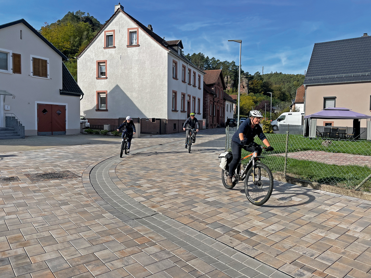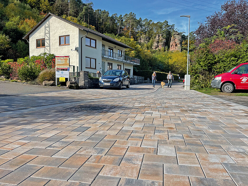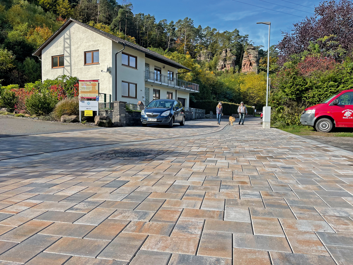 Das schmucke Städtchen wird von einigen mächtigen Felsgebilden überragt, die allesamt im Sonnenuntergang rötlich braun leuchten. Daher fiel auch die Entscheidung für die Farbe des zum Einsatz kommenden Pflasterbelages auf den warmen bräunlich changierenden Farbton »Muschelkalk«. Noch viel wichtiger als die Optik war den Verantwortlichen aber, dass sich die neu sanierten etwa 2 000 m² großen Flächen nicht unter der Last der Fahrzeuge verschieben. Marco Burkard vom ortsansässigen Ingenieurbüro Dilger: »Aus touristischer Sicht hat die Schillerstraße eine gewisse Bedeutung, da durch sie der überörtliche und stark frequentierte Wieslauter-Radweg führt. Neben den Anwohnern und Müllfahrzeugen, die die Straße befahren, wird die Straße aber auch von zahlreichen Wanderern genutzt, um zu einem unmittelbar westlich angrenzenden Aussichtsfelsen zu gelangen. Auch die am oberen Ende der Straße liegende Kneipp-Anlage ist ein Anziehungspunkt. Daher findet auf dem eigentlich eher kleinen Sträßchen schon eine gewisse Verkehrsbelastung statt«, so Burkard.