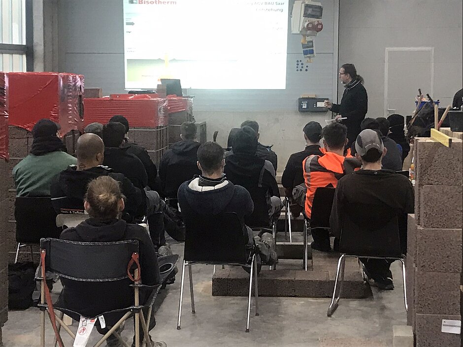Auf Einladung des Ausbildungszentrums der AGV Bau Saar in Saarbrücken konnten die beiden Bisotherm-Mitarbeiter Jörg Ewen (regionaler Bisotherm Fachberater) und Marco Schuck (Bisotherm Technik) den angehenden Maurern ausführlich die hochwärmedämmenden Bisotherm-Wandbaustoffe aus dem Naturbaustoff Bims vorstellen. Neben der Produktvorstellung des Lieferprogrammes wurden auch Informationen zum Tragverhalten von Mauerwerk und dem Verarbeiten der Steine nach den geltenden Normen, veranschaulicht durch Fotos von Baustellen.