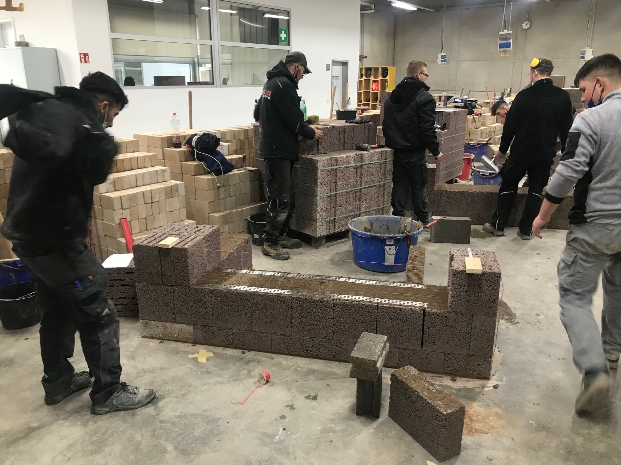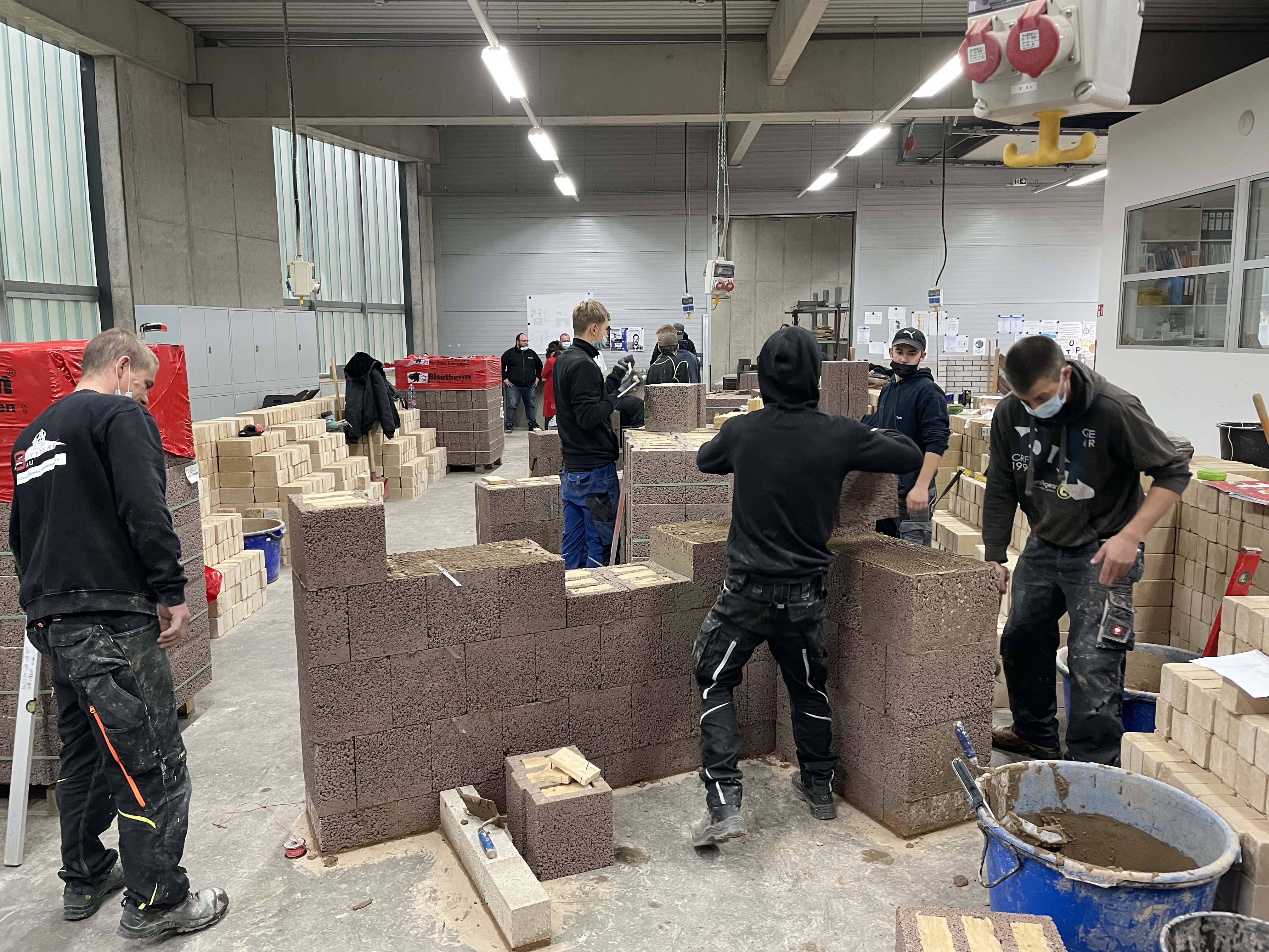 Nach der Mittagspause durften die angehenden Maurer dann zeigen, was sie am Vormittag theoretisch gelernt hatten. In Maurerteams zu je 3-4 Mann wurden anhand von Bauplänen Bisotherm-Steine, einschließlich des Anlegens der Ausgleichsschicht, verarbeitet. Dabei kamen sowohl die mit Mineralwolle gefüllten Bisomark-Steine als auch Bisoplan-Steine, ohne Zusatzdämmung, zum Einsatz.