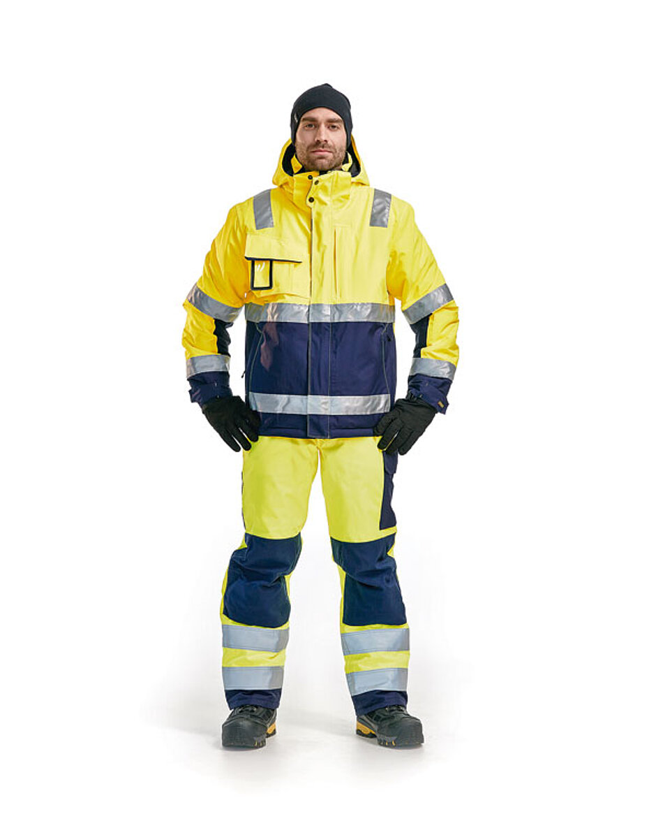 Die Winterjacke »High Vis« ist in den Farbkombinationen Gelb mit Marineblau oder Schwarz, Orange mit Marineblau und Rot mit Schwarz erhältlich. Die dunkel abgesetzten Flächen sind in Bereichen angebracht, die besonders beansprucht und häufiger dreckig werden. J