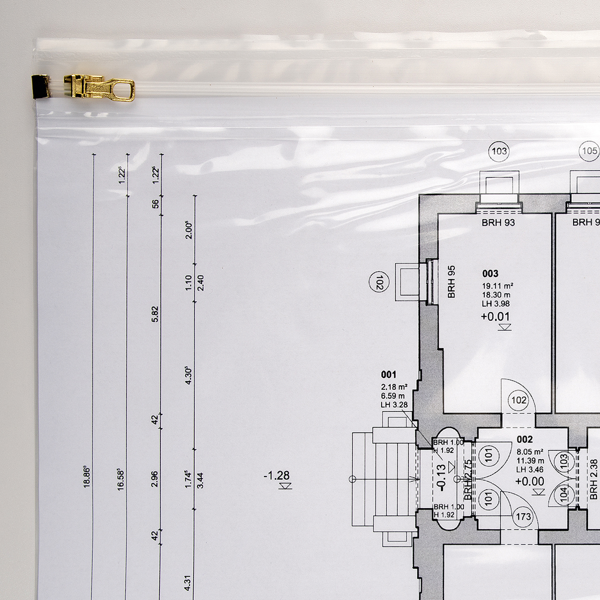 Für ein optimales Handling beim Einlegen der Dokumente sind die Planschutzhüllen etwas größer konzipiert als die typischen Planformate – so wird ein Einreißen oder Zerknittern des Bauplans vermieden. Die Hüllen sind in verschiedenen, handelsüblichen Formaten erhältlich: von DIN A4 (230 x 320 mm) bis zu einem Format von DIN A0 (900 x 1 280 mm). Auch individuelle Kundenwünsche sind möglich – für spezielle Einsatzgebiete oder Projekte, bei denen spezifische Bauplanformate benötigt werden, können Über- oder Sondergrößen angefragt werden. J