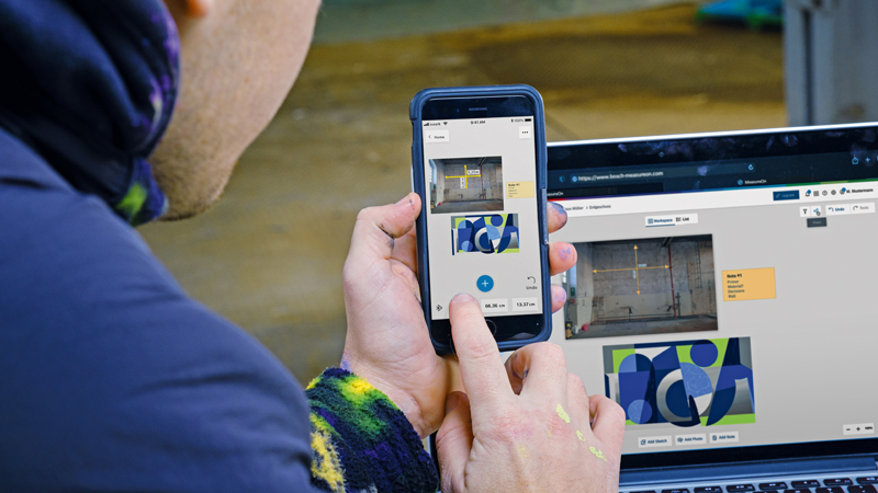 »Digitale Tools helfen mir sehr«, sagt der junge Künstler, »auch beim Malen.« Rivadeneira hat seinen Entwurf am Computer erstellt. Nun überträgt er die Maße der Wand via Bluetooth und Cloud automatisch auf sein Tablet und sein Smartphone. »Der Laser erspart mir viel Aufwand und schützt mich vor Übertragungsfehlern, die bei Notizen auf Papier passieren können«, sagt Rivadeneira. Die Vernetzung findet über die Cloud in Echtzeit und über alle Geräte hinweg statt. Der Laser-Entfernungsmesser sendet die Messwerte via Bluetooth in die »MeasureOn«-App. Von dort werden die Daten über eine verschlüsselte Verbindung zur »MeasureOn«-Cloud Instanz geschickt. Die Cloud-Infrastruktur wird in einem deutschen Rechenzentrum zur Verfügung gestellt. So kann Rivadeneira das Aufmaßblatt dank einer Web-App, die auf allen gängigen Browsern läuft, auch auf dem Desktop-Rechner bearbeiten.