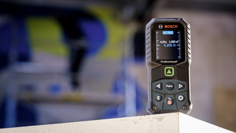Der »GLM 50-27 CG Professional« misst die Abstände vor Ort. Mithilfe des Bosch-Geräts und einem Bleistift markiert Rivadeneira Besonderheiten auf der Oberfläche und skizziert sein Motiv. Das stoßabsorbierende IP65-zertifizierte Gehäuse mit Gummiummantelung kann Stürze aus 1,5 m Höhe aushalten und verfügt über eine lange Akku-Laufzeit. Zudem eignet sich die Lasertechnologie dank des präzisen und klar zu sehenden grünen Punkts für das Ausmessen großer Flächen, selbst wenn es sehr hell ist. Ein weiterer Pluspunkt ist die Vernetzung.