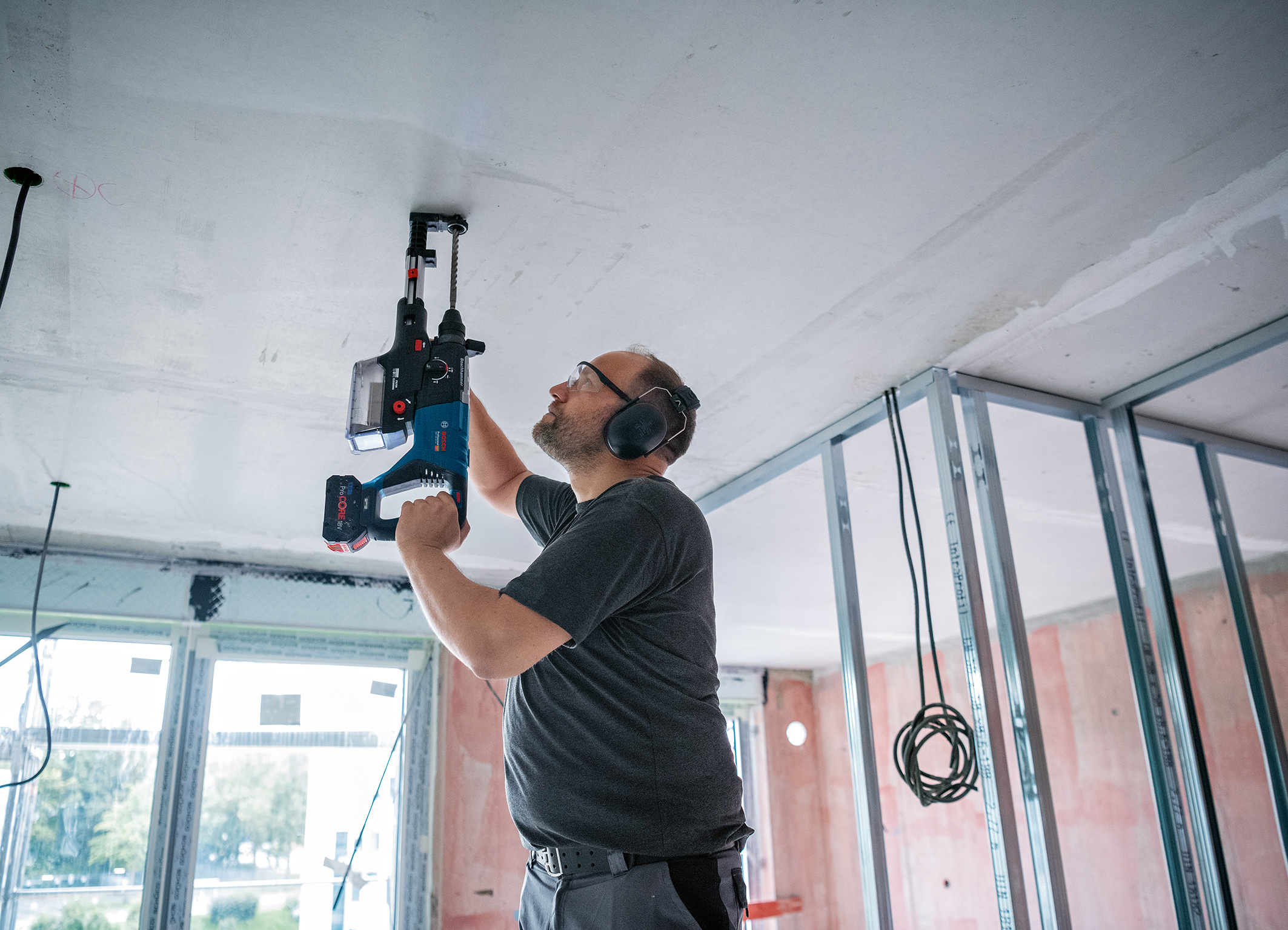 Der GBH 18V-28 DC Professional ist außerdem der einzige Akku-Bohrhammer seiner Klasse, der Handwerkern „Vibration Control“ – eine aktive Vibrationsdämpfung mit Gegenschwinger – sowie „KickBack Control“ bietet: Bei plötzlicher und unvorhersehbarer Rotation des Bohrhammers um die Bohrachse – etwa beim Verklemmen des Bohrers in Stahlbeton – schaltet der integrierte Sensor den Motor innerhalb eines Sekundenbruchteils ab. Das beugt unerwartetem Rückschlag vor und kann das Verletzungsrisiko reduzieren. Wird der AkkuBohrhammer in größeren Höhen verwendet, beispielsweise auf einem Gerüst, kann er außerdem gegen Absturz gesichert werden. Das minimiert das Risiko, andere Personen zu verletzen. Und wer den Bohrhammer zwischen den Arbeitsschritten sicher verwahren möchte, hängt ihn einfach an den integrierten Aufbewahrungshaken.