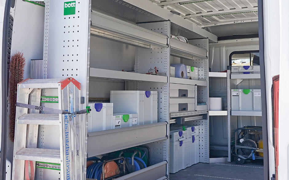 Für effiziente Arbeitsabläufe ist das gute Verstauen von Werkzeug, Maschinen und Material grundlegend. Deshalb wurde der neue »Peugeot Boxer« von Fuchs Holzbaulösungen mit »Bott vario3« ausgestattet. Junior-Geschäftsführerin Theresa Fuchs wollte wissen, inwieweit sich hiermit sowohl großes als auch kompaktes Equipment sowie alle Kleinteile übersichtlich im Fahrzeug unterbringen lassen. Laut ihrem Testurteil helfen ihr die Produkte von Bott, Festool und Tanos sehr gut dabei, die Arbeitsabläufe ihrer Mitarbeiter zu unterstützen und sauber abzuwickeln.
