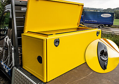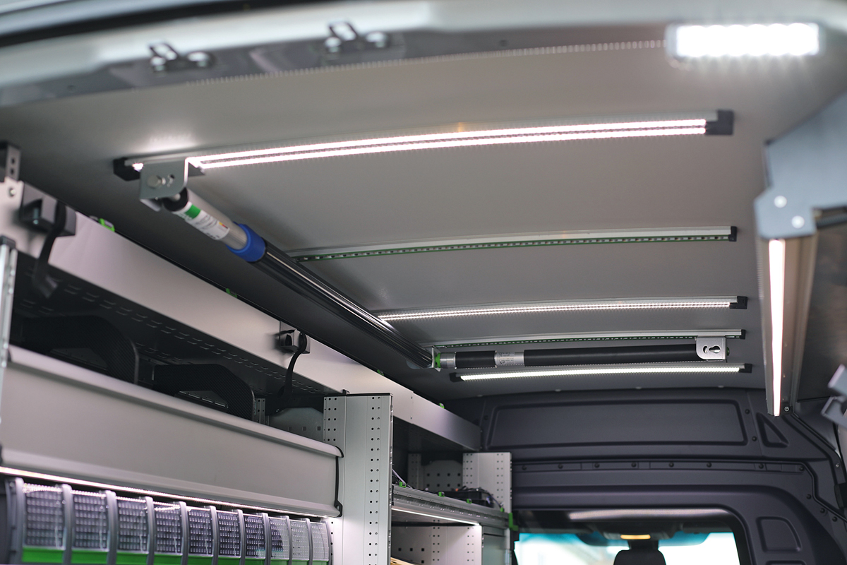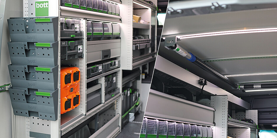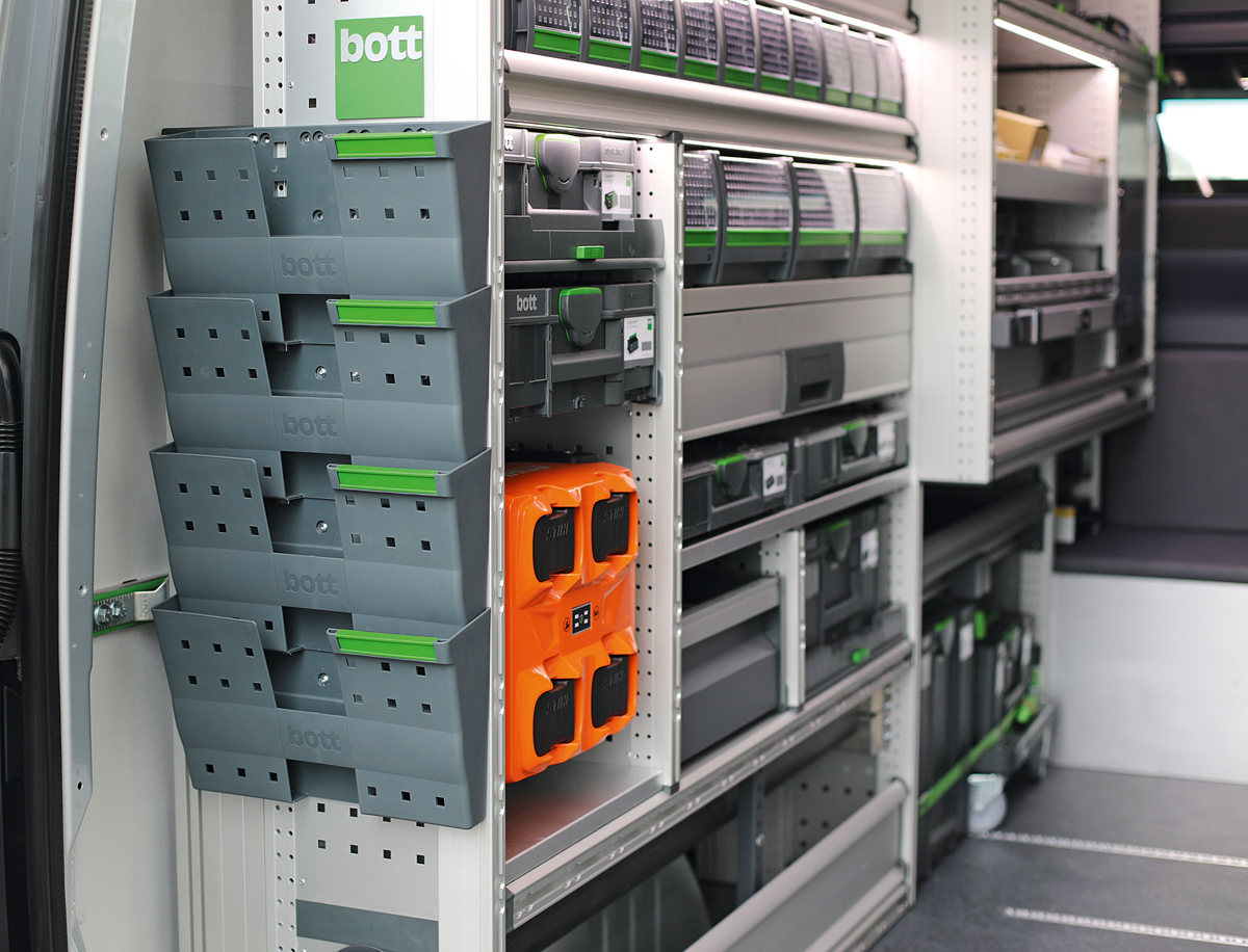 Für Verbrauchsgegenstände wie Schrauben und Muttern bieten sich abgeschrägte Ablageflächen an. Wird eine Schachtel entnommen, rückt die nächste automatisch nach. Auch mit Trennwänden versehene Schubfächer und entnehmbare »bottBox«-Sichtlagerkästen sind für Kleinteile geeignet. Werkzeuge und andere Verbrauchsmaterialien kommen in »Systainer³«-Servicekoffern unter. Sie lassen sich mithilfe von seitlichen Schienen passgenau in der Einrichtung einrasten. Außerdem können diese und andere Koffer auf dem Fahrzeugboden festgeklemmt oder mit Spanngurten verzurrt werden.