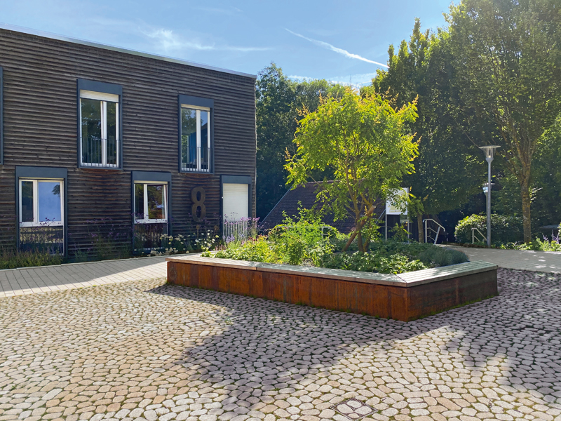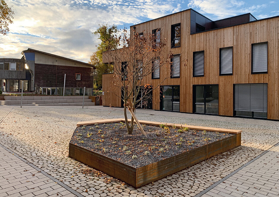 Wie bei den Gebäuden, von denen einige – allerdings mittlerweile saniert – noch aus den 1960er-Jahren stammen, andere wiederum hochmodern sind, wurde auch im Freiraum auf die Balance zwischen moderner Architektur und gewachsenen Strukturen geachtet. Großzügige Sitzstufen und Hochbeete mit Holzauflagen sorgen für eine hohe Aufenthaltsqualität. Dort kann man alleine oder in der Gruppe sitzen, Ruhe finden oder sich unterhalten.