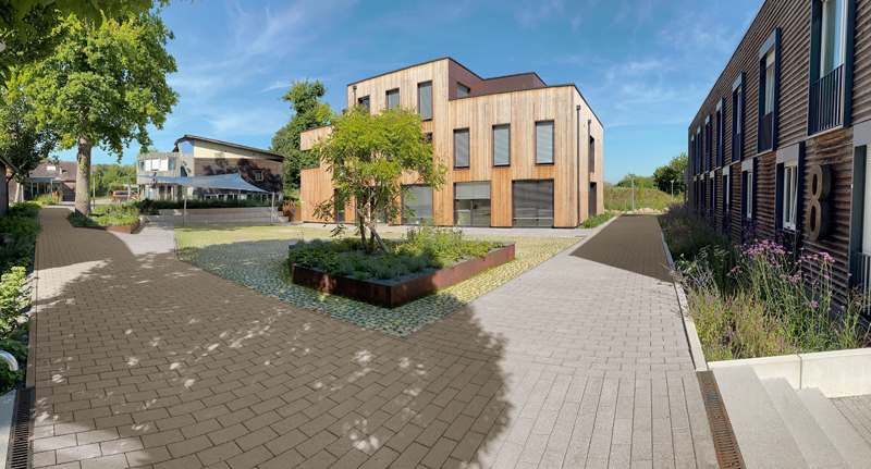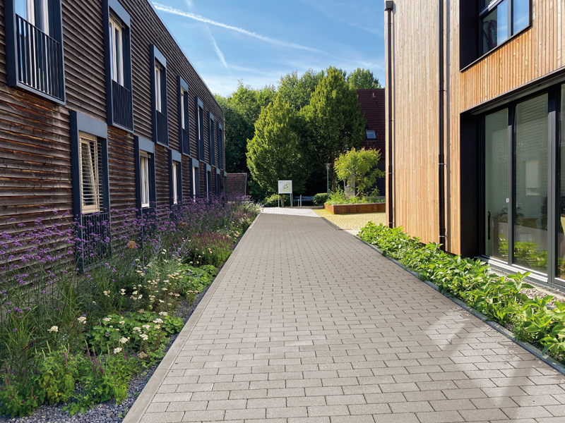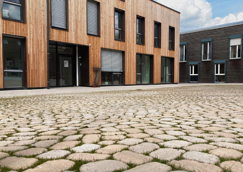 Auch ökologische Anforderungen konnten auf der Fläche erfüllt werden. Die grünen Fugen von ARENA® sorgen für eine optimale Entwässerung des Platzes und die organische Form der Steine ermöglichen effektiven Materialeinsatz. Eingefasst ist die »Campus Mitte« von linear verlaufendem REDOTTO-RC® Pflaster. Der Pflasterstein, in dessen Herstellungsprozess ausgewählter Abbruch- und Restbeton als Zuschlag wiederverwendet werden, schont wertvolle Ressourcen. Die geradlinigen Wege bilden einen wirkungsvollen Kontrast zum lebendigen Flächenbild der Platzmitte. In Kombination mit dem neuen Gebäude und seiner Holzfassade wird beim Waldhaus dem umweltschonenden Bauen Rechnung getragen.