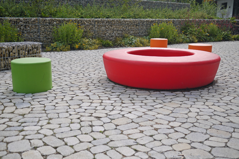Eine kleinere, ebenfalls mit »Arena Nova« gepflasterte Fläche gibt es im Freibereich auf der gegenüberliegenden Gebäudeseite. Dort befindet sich der Übergang zum grünen Klassenzimmer und zum Wald, wo im Freien gelernt wird. Die Pausen verbringen die Schüler auf dem Pausenschulhof. »Für Schulen sind drei Bereiche wichtig: Die Schüler brauchen Möglichkeiten, sich zu bewegen, Platz zum Spielen und Ruhezonen«, weiß Martin Karl.