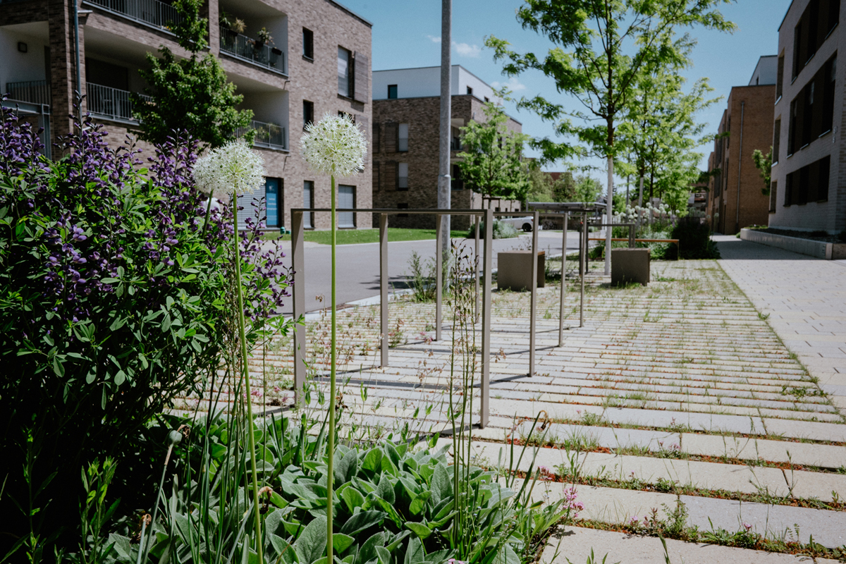 Der Längsrasenfugenstein mit »Vario«-Funktion besteht aus 30 Prozent Gesteins-Recyclat. Stabile Subnocken erlauben unterschiedlich breite Fugen (30 und 55 mm), in denen Wasser versickern kann, die aber auch Raum für Begrünung bieten. Insgesamt muss so laut Hersteller weniger Material auf der Fläche eingesetzt werden. Mit dem formal reduzierten Stein lassen sich Bodenflächen mit unterschiedlichen Rastern strukturieren – die Fugen werden zum Gestaltungsmerkmal. Aufgrund seiner zum Patent angemeldeten Nut-Feder-Verzahnung ist der Längsrasenfugenstein auch für starke Beanspruchung geeignet. In seiner Einfachheit, hinter der ein pfiffiges Konzept steckt, leiste er einen wichtigen Beitrag zur Klimaresilienz von Städten, so die Jury.