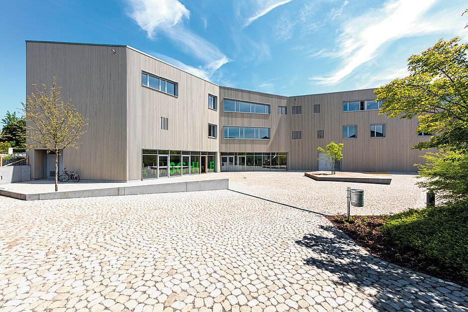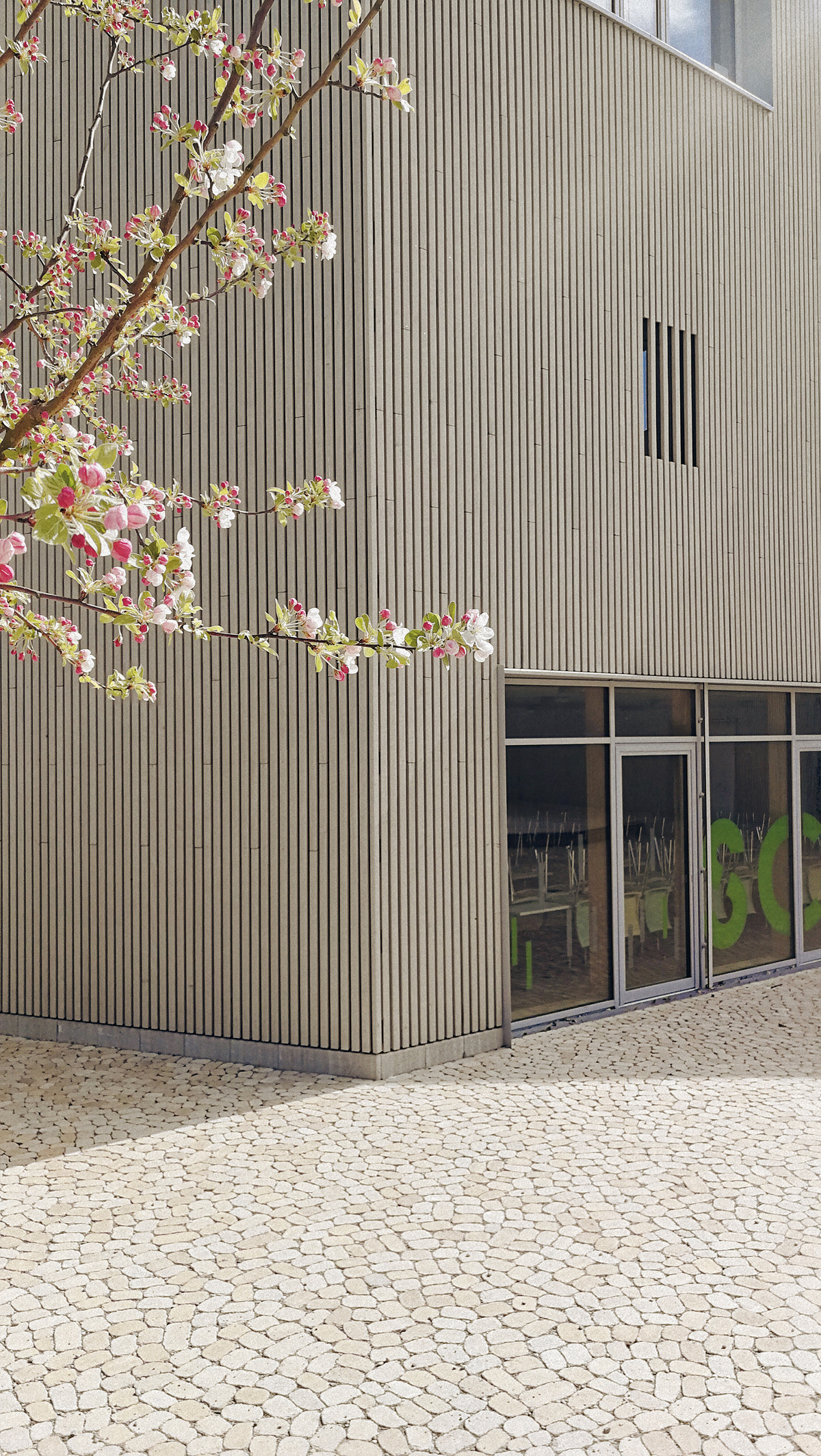 Fast monolithisch wirkt das polygonale Gebäudeensemble, das den gemeinsamen Hof von bestehender Grundschule und Neubau schützt. Topografie, Grundstückform sowie städtebauliche Bezüge gaben dem Gebäude seinen architektonischen Ausdruck. Die vertikale Lattung der Fassade aus lasierter Weißtanne umhüllt das Volumen und vermittelt eine geradlinige und klare Ästhetik. Das Gebäude ist so platziert, dass sowohl zur Straße als auch zu den Nachbargebäuden viel Freifläche bleibt.