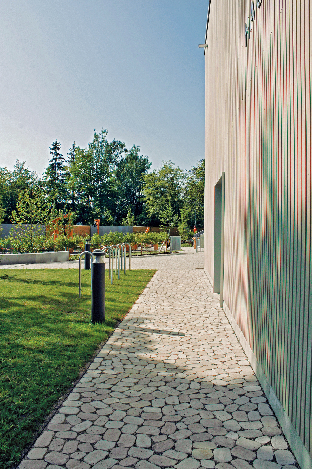 »Wir bevorzugen natürliche, einladende Materialien, die eine angenehme Raumatmosphäre herstellen, in der sich die Kinder wohlfühlen. Mit der Holzfassade und dem Gründach fügt sich das Gebäude sehr gut in die Garten- und Spiellandschaft ringsum ein.« So erklärt Architekt Stefan Glück die Auswahl der Materialien. Ähnlich lag der Fokus bei der Materialauswahl auch bei der Gestaltung der Freiflächen, wo man auf Produkte des Amstettener Unternehmens Braun-Steine zurückgriff. In geraden Zügen umrahmt die Fläche harmonisch den Polygonalzug des Gebäudes sowie Spielgeräte und Grünflächen. Das organische »Arena«-Pflaster von Braun-Steine wurde durchgängig verlegt und verbindet alle Bereiche fließend miteinander. Mit dem hellen, warmen Farbton entsteht eine leichte und freundliche Atmosphäre. Die »Arena«-Pflastersteine sind 8 cm dick und im Farbton Kalkstein-Schattiert gehalten.