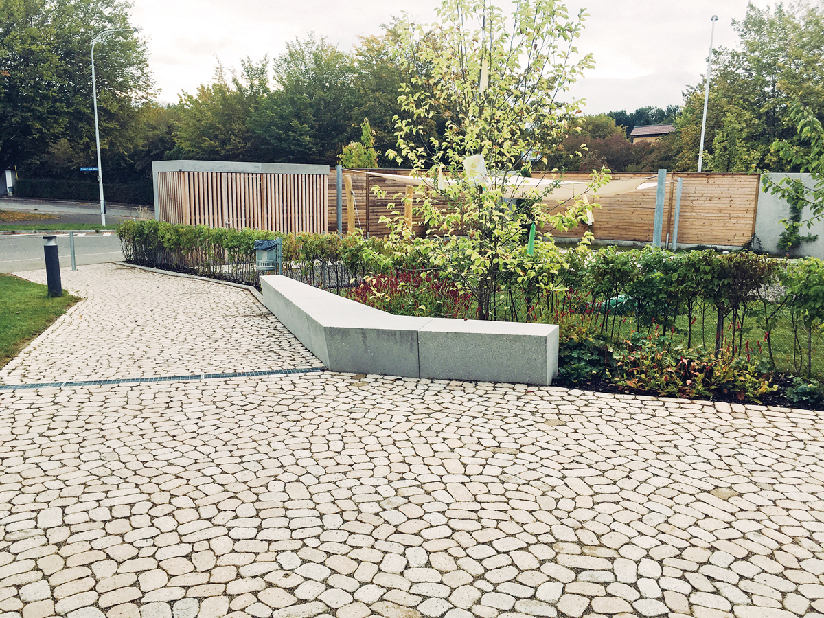 Auf dem Grundstück bilden unterschiedliche Geländehöhen eine abwechslungsreiche Topografie aus ebenen Bereichen wie auch ansteigenden Flächen. Diese anspruchsvolle Höhensituation gleicht der ungerichtet verlegte Pflasterbelag wie selbstverständlich aus. Darüber hinaus sorgt der hohe Fugenanteil für eine sehr gute Versickerung des Regenwassers und trotz der schwierigen Gefällesituation kann so auch die Bildung von Stauwasser vermieden werden. J