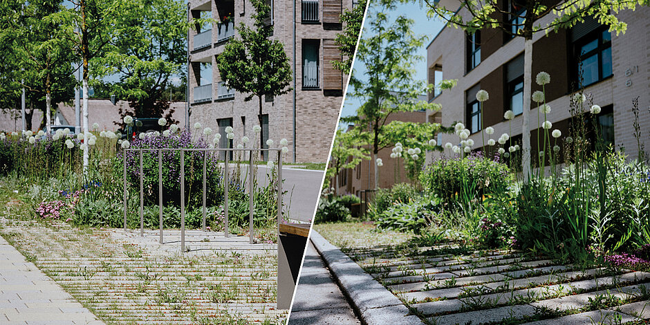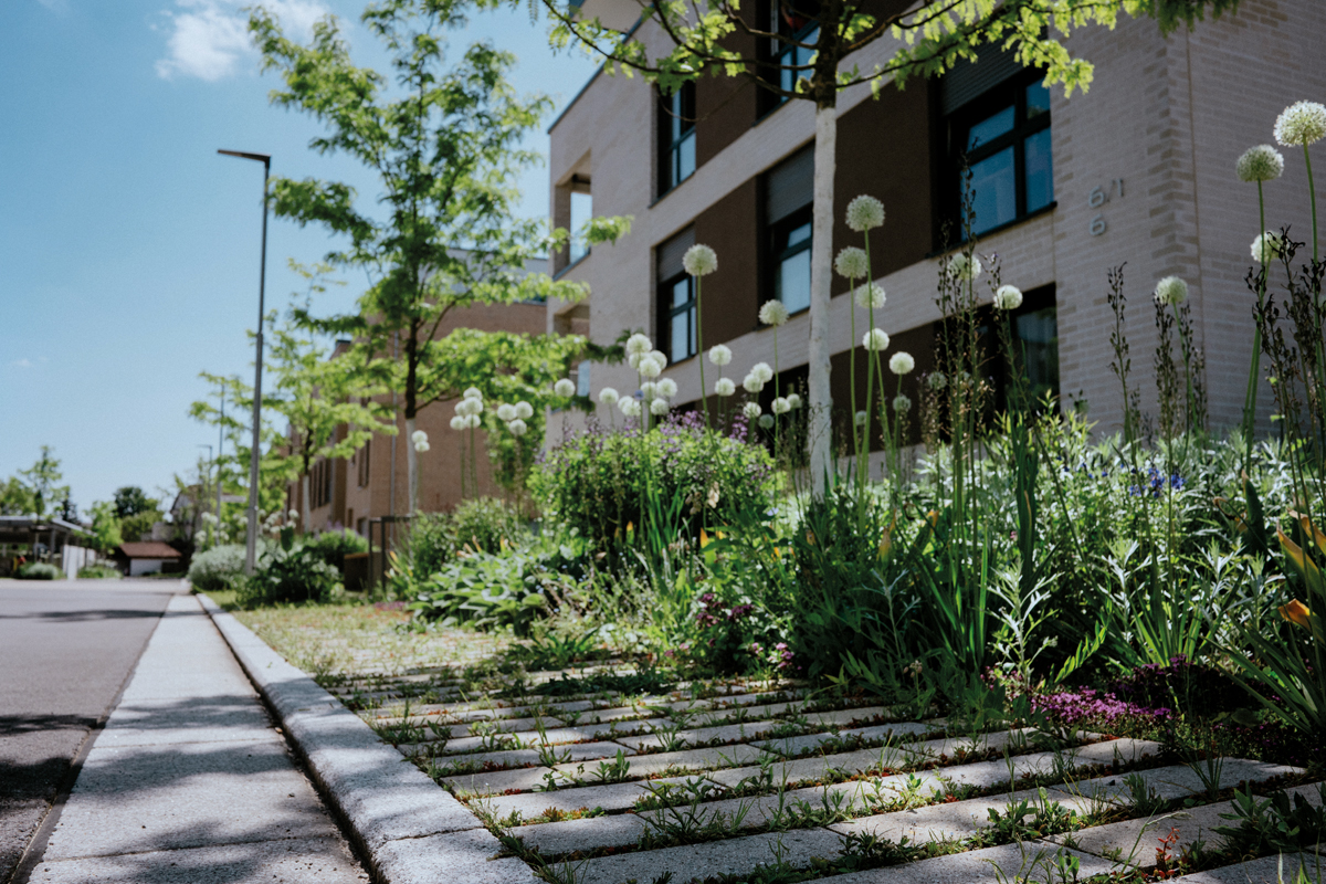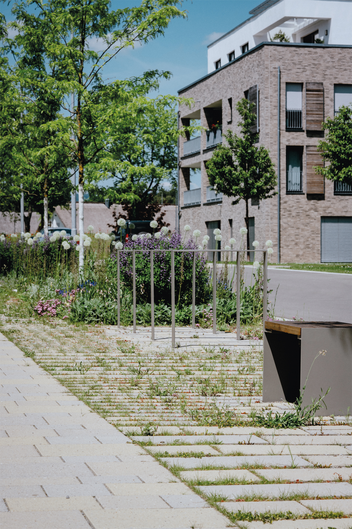 »Die breiten Vegetationsfugen des Pflasters brachten mich zudem auf die Idee, ausgewählte Geophyten, die auf extensiven Dachbegrünung gedeihen, zu pflanzen und eine autochthone Wildkräutermischung auszubringen«, verrät Gutermann. Nun erfreuen im Frühling Krokusse, Weinberghyazinthen und eine Wildtulpenart die Anwohner und lassen die Pflasterfarben gleich noch intensiver erscheinen. Auch die Wildkräuter haben sich zwischen dem Längsrasenfugenpflaster sehr gut etabliert und sorgen mit ihren Blüten für Farbtupfer im Sommer. Die breiten, mittlerweile grünen Fugen versickern zuverlässig das anfallende Regenwasser und zeichnen einen weichen Übergang zwischen den Stauden- und Multifunktionsflächen. Durch die Verdunstung der Pflanzen innerhalb der Fugen heizen sich diese Abschnitte im Sommer weniger auf, was für eine angenehme Aufenthaltsqualität sorgt. Die Gehwege sind mit einer normalen Fugenbreite verlegt, was eine bequeme Passierbarkeit für Rollstühle, Rollatoren und Kinderwägen gewährleistet.