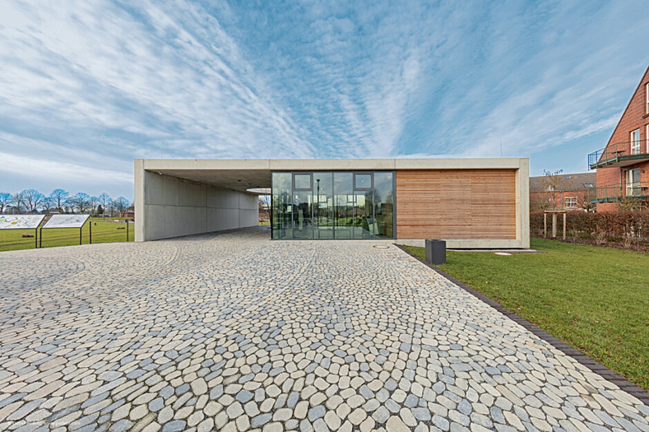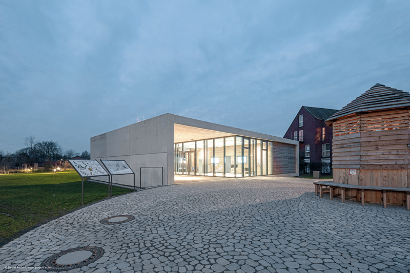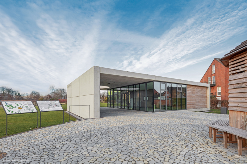 In klarer Kubatur und reduzierter Formensprache beschränkt sich das Empfangsgebäude der quadrat + architektengesellschaft mbH aus Recklinghausen auf das Wesentliche. Der Baukörper aus Sichtbeton, Glas und Lärchenholz meistert es, sowohl Transparenz als auch Geschlossenheit zu vermitteln. Der offene, von Sichtbeton gerahmte Durchgang empfängt die Besucher als Entree und lenkt sie sowohl Richtung Gradierwerk als auch ins Innere des Informationszentrums. Letzteres schafft trotz Geschlossenheit einen lichten Raum durch seine filigrane Pfosten-Riegel-Fassade innerhalb des umlaufenden Sichtbetonrahmens.