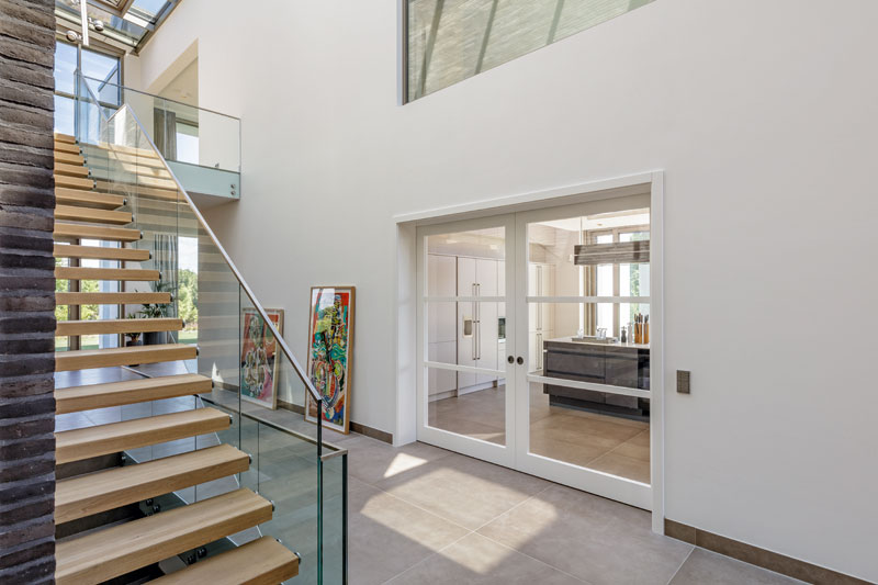 Beim Architektenhaus der gehobenen Klasse mit repräsentativen, lichtdurchfluteten Räumen im Erdgeschoss standen imponierendes Aussehen, Persönlichkeit und Ausstrahlung der Türen im Vordergrund. Für die Türen bedeutete dies, den verschiedenen Lebensbereichen eine gewisse Trennng zu verleihen, aber trotzdem die gelebte Großzügigkeit der Hausherren widerzuspiegeln.