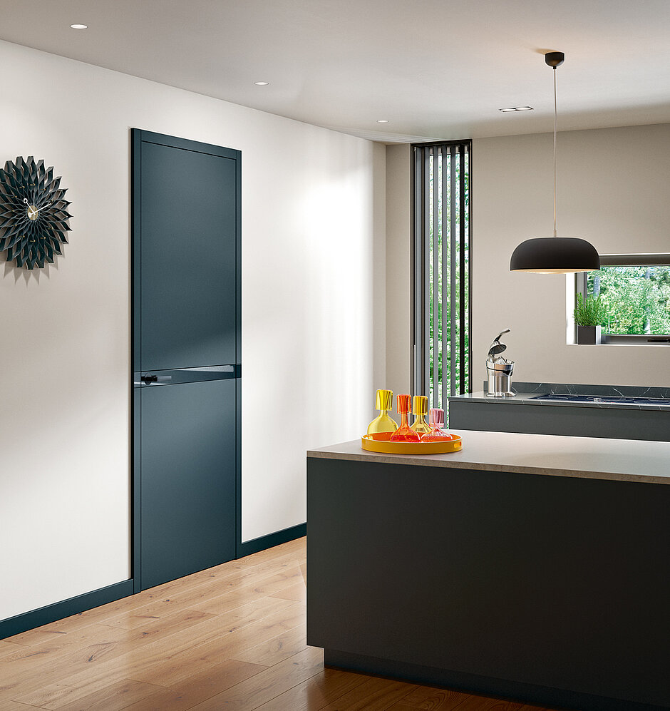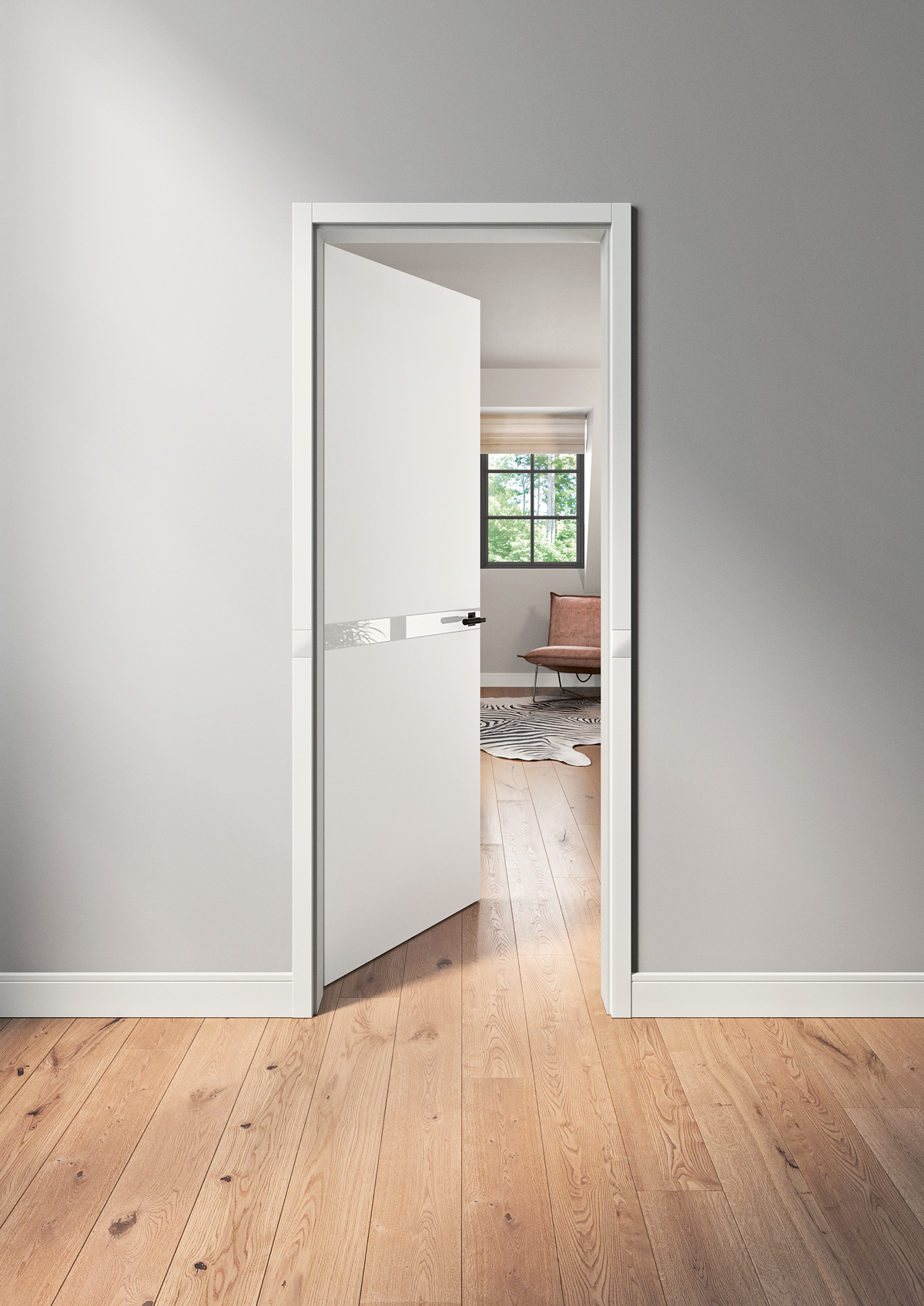 Das Design der »Galerie«-Serie ist eigentlich nichts weiter als ein Streifen. Dahinter steht die Kunst, Kontraste zu einem harmonischen Ganzen zu vereinen. Fast die gesamte Türfläche dominiert eine softmatte Lackierung, die lediglich von einem Streifen Hochglanz unterbrochen und betont wird. Dieser wird von Brückert + Kärner sorgfältig von Hand auf Hochglanz poliert und eingepasst. Es sind eben keine Türen, die eine maschinelle Produktionsstraße durchlaufen, wie der Hersteller hervorhebt. Hinzu kommt eine erforderliche Passgenauigkeit, denn der hochglänzende Streifen setzt sich auf der Zarge fort und erfordert beim Einbau Präzision.