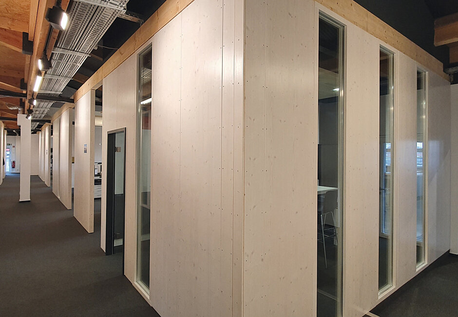 Um räumliche Abgrenzungen zu schaffen, ohne die offene Atmosphäre im Büroalltag zu gefährden, lassen sich Aussparungen oder Glaselemente in die Wand integrieren. Zugleich sollte aber auch die sichtschützende Funktion bewahrt werden. »wall4all« verfügt in der Basisversion über eine Oberfläche aus Gipskarton. Letztere lässt sich nach dem Verfugen beliebig finalisieren. In der Designvariante, bei der Arbeitsschritte wie das Verfugen entfallen, ist das System mit naturbelassener oder grau beziehungsweise weiß lasierter Fichte mit sichtbarer Holzstruktur erhältlich. J