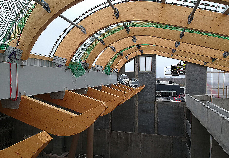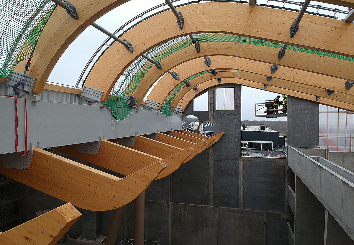 Die geschwungene Formgebung erforderte eine präzise Planung und Fertigung, da jede Anschlussplatte der Druckstäbe unterschiedliche Winkel aufweist. Mithilfe von BIM und einem digitalen Gebäudemodell konnten sämtliche Bauteile millimetergenau geplant und aufeinander abgestimmt werden. Das 3D-Modell diente nicht nur als Grundlage für die Werk- und Montageplanung, sondern auch für die Kollisionsprüfung zwischen den Gewerken. So wurde sichergestellt, dass die komplexe Geometrie der Dachkonstruktion reibungslos umgesetzt werden konnte.