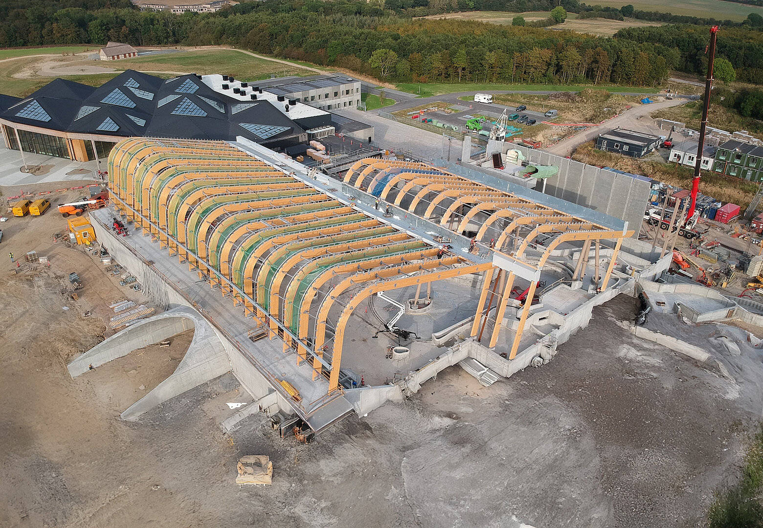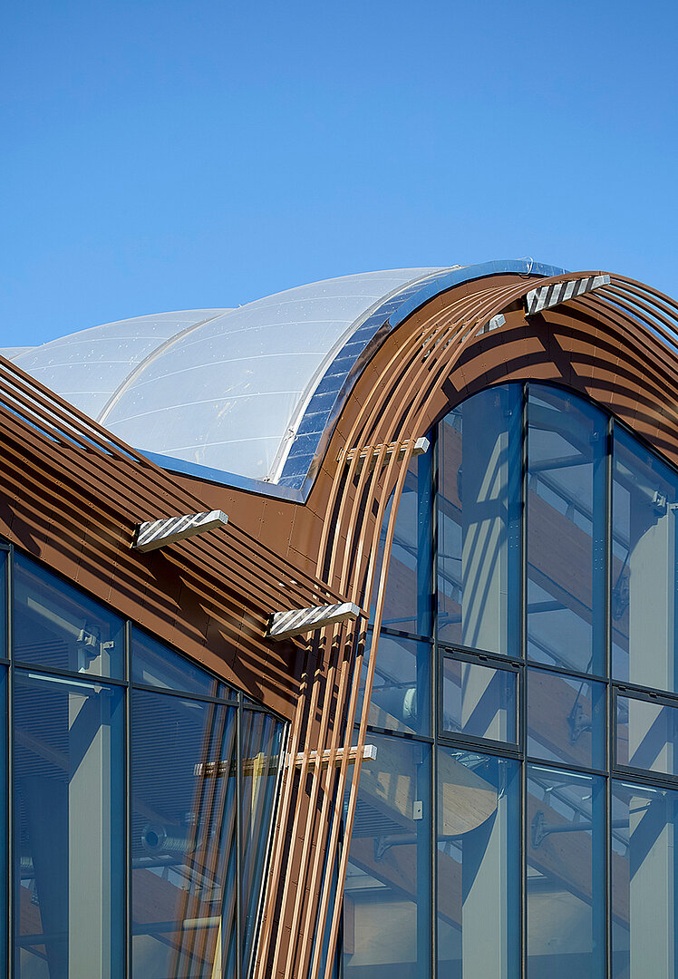 Um das besondere Bild der wellenförmigen Dachkonstruktion zu erzeugen, ist eine komplexe und zugleich filigrane Tragkonstruktion des großen Hallenschiffs notwendig. Diese fertigte Brüninghoff aus Holz und Stahl – und übernahm auch die Montage vor Ort in Dänemark. Für die Gebäudehülle wird ETFE-Folie verwendet. Durch ihr geringes Eigengewicht kann eine besonders schlanke Tragkonstruktion umgesetzt werden. Letztere besteht aus Brettschichtholz sowie Stahlbauteilen. Hierzu wurden zunächst im 3D-Gebäudemodell Konstruktionspläne der Brettschichtholzteile erstellt, die als Basis für Montage- und Werkpläne dienten. Auch wurden Werkstattzeichnungen und Maschinendaten für den Stahl- und Holzbau angefertigt.