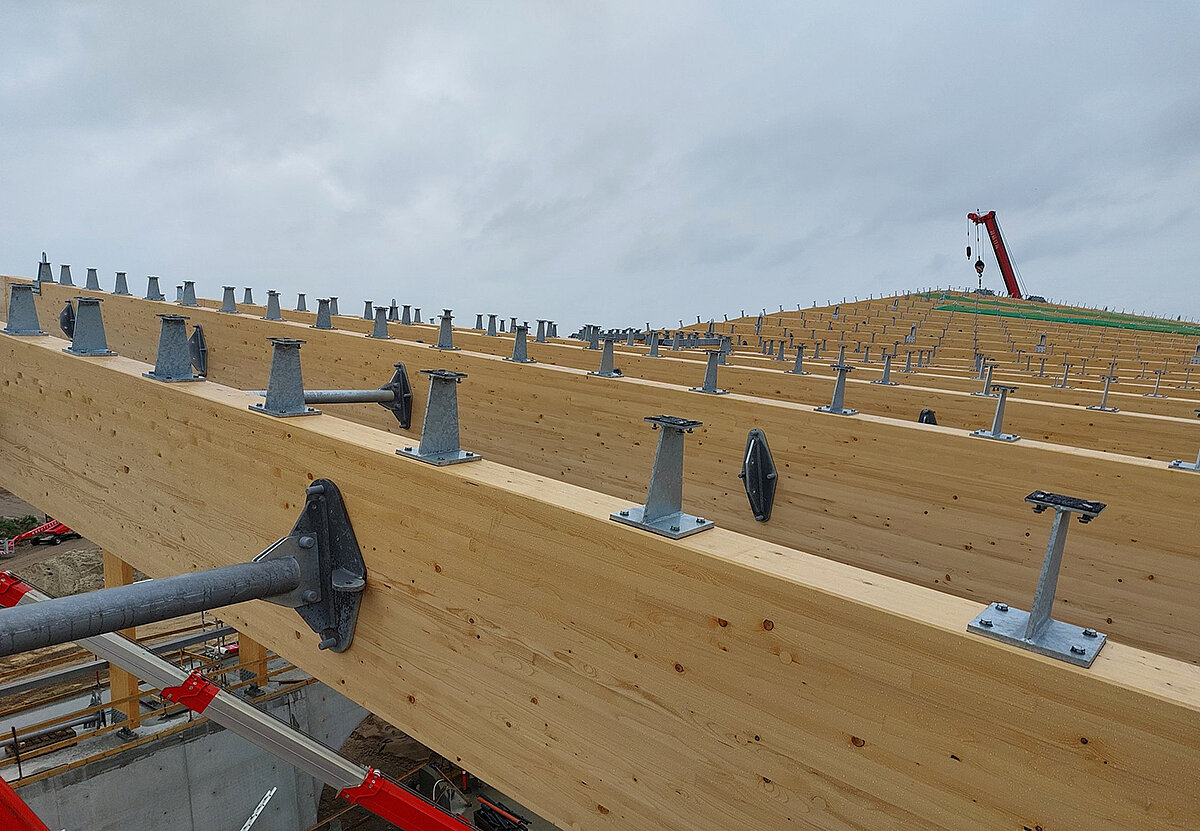 Die Dachkonstruktion kombiniert Brettschichtholz und feuerverzinkten Stahl, um die Vorteile beider Materialien optimal zu nutzen. Holz, ein nachwachsender Rohstoff, wurde zu 100 Prozent aus PEFC-zertifizierten Quellen bezogen und trägt zur Reduzierung des CO2-Fußabdrucks bei. Die Holzbauteile wurden im Partnerwerk in Westerkappeln