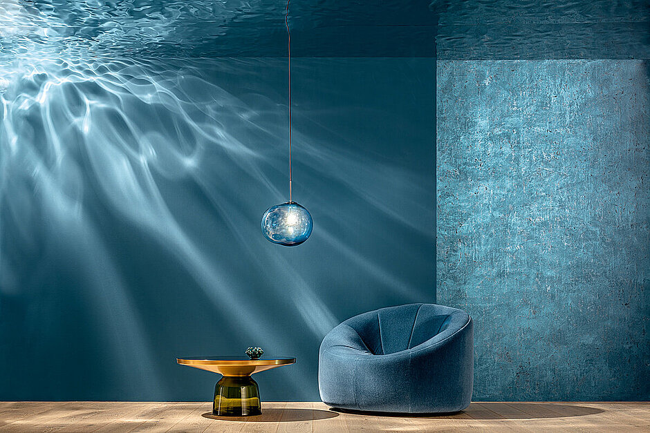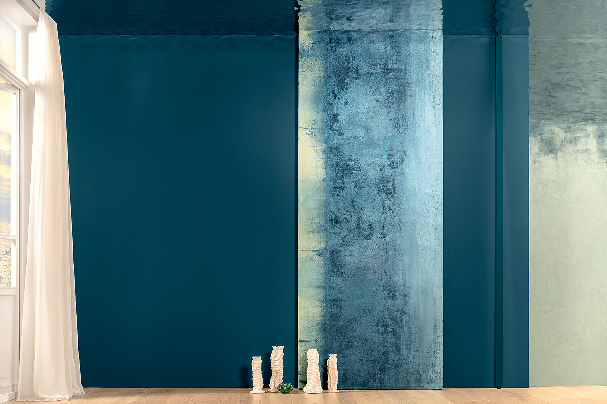 Gerade der Quarzzuschlag ist für die Gesamtwirkung elementar, denn diese Quarzteilchen mit ihrer rauen Haptik und Optik ergänzen die Tiefe des Blaus, die seidige Basisfläche und die illustren Pigmentreflexe mit einem gänzlich anderen, mineralisch-substanziellen Effekt. Die Helligkeiten der beiden Farbnuancen unterscheiden sich übrigens nur marginal. Reflexe, Tiefe, Strömungen und scheinbar fließende Partikel stehen assoziativ für den Ozean.