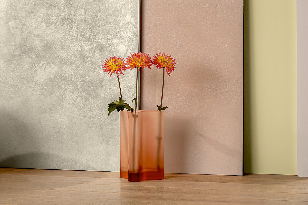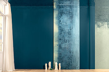 Dass die Trendfarben 2026 die Dualität von Über- und Unterwasser-Perspektiven verbinden, veranschaulicht besonders die Kreativoberfläche des Jahres: »Stucco Eleganza Fusion« greift – wie schon die Oberfläche des Vorjahres – auf das vielseitige Standardprodukt »Stucco Eleganza« zurück. Das Material mit seiner seidig-perlmuttartigen Oberflächenwirkung wird zunächst zweifach per Venezianerkelle im Farbton des Jahres vollflächig aufgespachtelt. Nach der Trocknung appliziert man – wiederum mit der Kelle – kreisförmig die metallisch pigmentierte und mit Quarzkörnchen angereicherte »Metallocryl«-Dispersion.