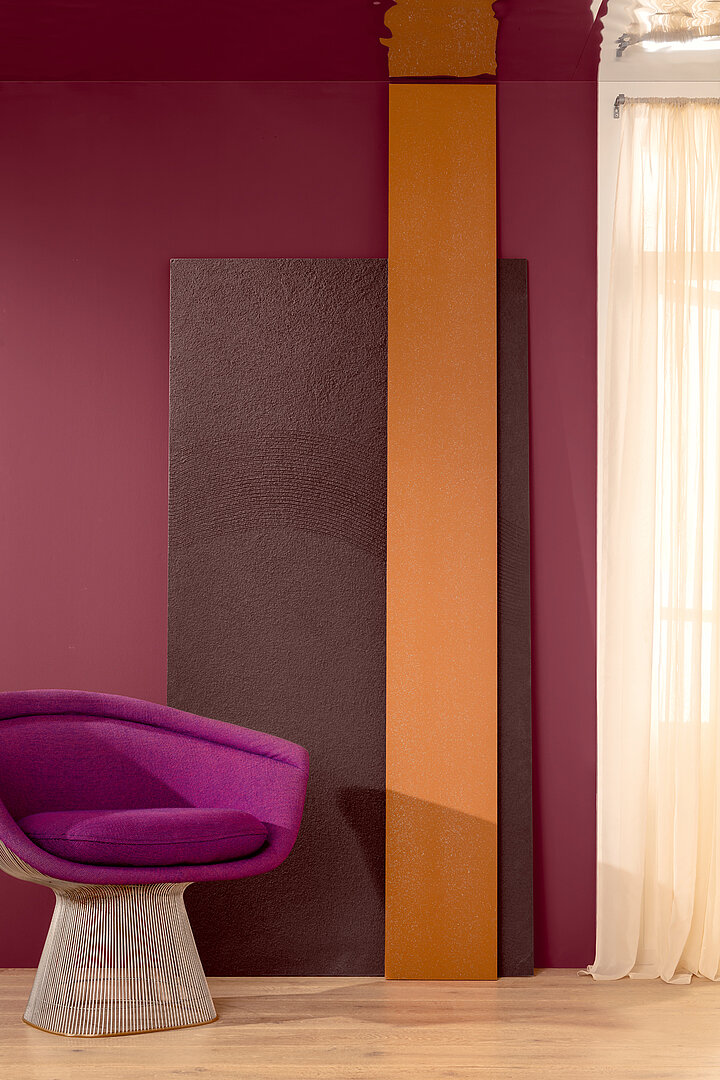 Einem ganz anderen Ansatz folgt wiederum Farbwelt drei. Ihr Schwerpunkt liegt auf dunklen, intensiven Tönen aus dem Rotbereich – von verhülltem Orangerot bis zu einem elektrisierend-intensiven Bordeauxrot. Das kräftige Spektrum der Farbwelt drei wird durch den Lackton »Laser 25« mit seiner leuchtend-reinen Anmutung ergänzt – die Farbe des Jahres fließt erneut als komplementäre Note ein.