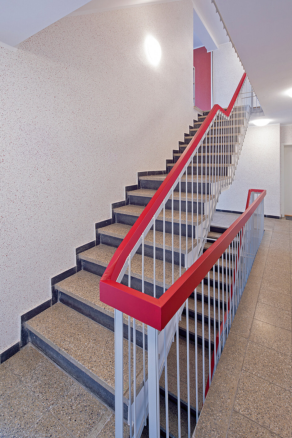 Der B&S gehe es dabei um mehr als die bauliche Funktionalität: Verankert in der Philosophie des Unternehmens sei eine »Wertigkeit durch Gestaltung« – und das gelte nicht nur für die Fassade, sondern ebenso für gemeinschaftlich genutzte Bereiche wie das Treppenhaus. Schon seit vielen Jahren arbeitet das Unternehmen beim Thema Gestaltung mit dem Caparol FarbDesignStudio zusammen und lässt bei Sanierungsmaßnahmen für jedes seiner Objekte ein individuelles Farbkonzept erstellen.