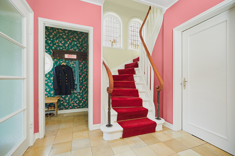 Ganz anders im Flur: Der Eingangsbereich des Hauses hat einen sandfarbenen Steinboden – und eine Garderobe, deren Rückwand mit einem auffälligen Stoff bezogenen ist: Rot-rosé-farbene Blümchen ranken sich darauf über einen flaschengrünen Hintergrund. Die angrenzende Treppe mit rotem Läufer galt es ebenso einzubinden wie auch die original erhaltenen Buntglasfenster in grünlicher und violetter Färbung. Daher fiel die Wahl auf einen sanften, beerigen Rotton für die Flurwände und im Treppenhaus auf ein zartes Grün. »Die Räume sind über Sichtachsen miteinander verbunden. Vom Wohn- und Esszimmer blickt man in den Flur und das Treppenhaus. Auch, wenn hier viel Farbe zum Einsatz kommt, ergibt sich gerade durch das Spiel der Kontraste ein stimmiges und harmonisches Gesamtbild.«