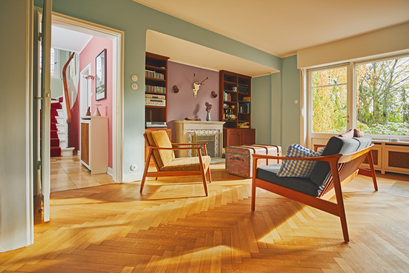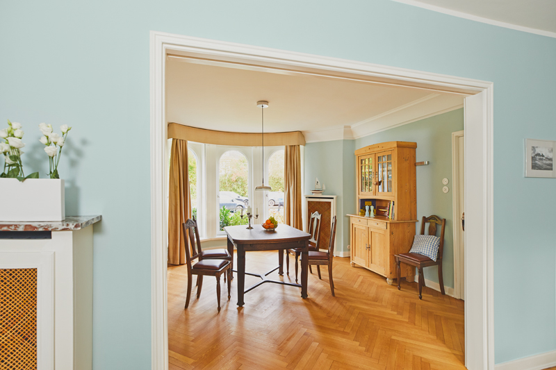 »Uns war wichtig, viele der originalen Elemente im Haus zu erhalten. Wir haben ein Faible für alte Dinge und haben sogar die Einfachverglasung behalten«, sagt Besitzer Claas Lehmann, der das Haus mit seiner Frau Sophie Heyer im Jahr 2019 erworben hat und es heute gemeinsam mit den zwei kleinen Töchtern bewohnt. Übernommen hat die Familie die alte Villa von einem Vorbesitzer, der dort über Jahrzehnte gelebt hatte. Der Zustand des Hauses: gepflegt. Technik und Ausstattung: komplett veraltet. »Keine Dämmung, keine Isolierung, nichts war vorhanden. Wir haben alles neu gemacht, auch die Rohrleitungen und die Elektrik«, erzählt Lehmann weiter. »Und dann standen wir irgendwann vor der Frage, wie wir die Räume farblich gestalten sollten. Eine wirkliche Vision hatten wir nicht, aber so viel war klar: Mit weißen Wänden ist es hier nicht getan.« Zum Glück musste die Familie nicht lange nach Unterstützung suchen: Claas Lehmanns Schwester, Martina Lehmann, ist im FarbDesignStudio von Caparol tätig. Die Herausforderung, ein Farbkonzept für die Innenräume zu entwickeln, nahm sie gerne an.