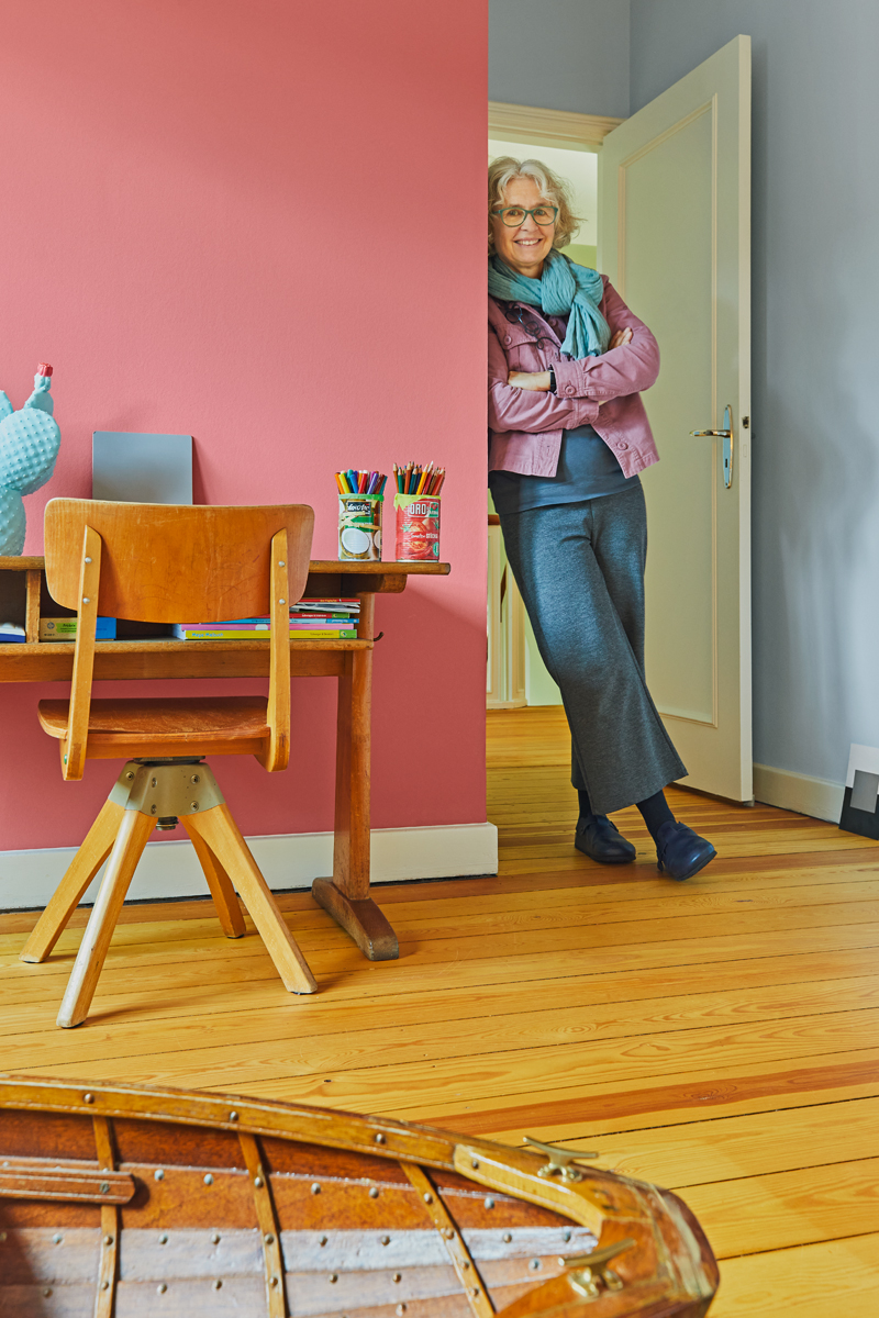 Den Ausgangspunkt für die Entwicklung des Farbkonzepts bildeten Wohn- und Esszimmer, die miteinander verbunden sind. Beide Räume verfügen über einen schönen, alten Holzboden, der im Fischgrät-Muster verlegt ist. »Der Boden weist einen angenehmen, warmen Farbton auf, wie auch einzelne Möbelstücke und die alten Vorhangstoffe in Ocker. Dem habe ich ein helles, kühltoniges Grünblau entgegengesetzt, das sich durch beide Räume zieht. Die Farbwahl passt zur Familie, die eine große Leidenschaft fürs Segeln hat: Der Boden erinnert an ein Schiffsdeck, die Wandfarben an das Meer«, erklärt Martina Lehmann. Im Kontrast dazu setzte sie im Kaminbereich einen Akzent aus einem vergrauten Rotviolett, das hervorragend mit den historischen Kacheln am Kamin korrespondiert. Von dort aus ging es Schritt für Schritt, Raum für Raum durchs ganze Haus: In der Küche zieht bereits eine knallrote Einbauküche aus den sechziger Jahren alle Blicke auf sich, auch der Boden im schwarz-weißen Schachbrettmuster ist ein echter Hingucker. Für Wand und Decke in der Küche schlug Martina Lehmann deshalb einen zurückhaltenden Anstrich in einem Sandton vor.