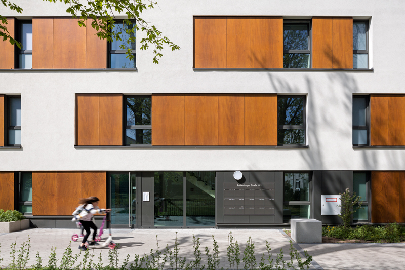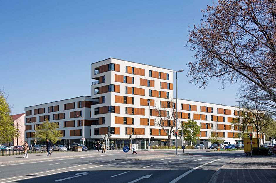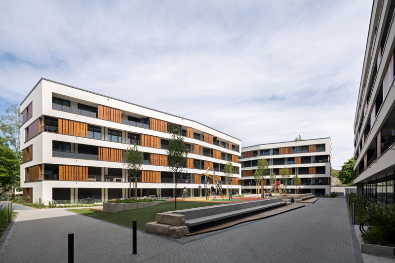Das Quartier gruppiert sich um einen Innenhof und bietet insgesamt 94 Wohnungen, 24 davon als geförderten Wohnraum und 70 frei finanziert. Die Bauzeit betrug rund zweieinhalb Jahre. Das Besondere dieses modernen städtebaulichen Ensembles ist der ausgeprägte soziale Charakter: Die 2-, 3- und 4-Zimmer-Wohnungen sind beispielsweise zu 100 Prozent barrierefrei und teilweise auch rollstuhlgerecht. Mit dieser Art des demografiegerechten und inklusiven Bauens wurden die Voraussetzungen geschaffen, mehrere Generationen in einem Gebäude zu vereinen und so zusammenzuführen – eine ungezwungene Art der Begegnung, von der alle Parteien profitieren können und den heutigen Anforderungen an ein soziales Miteinander beispielhaft Rechnung trägt.