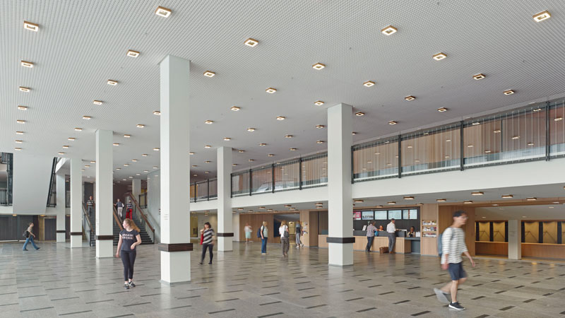 Die Entscheidung fiel unter anderem auf »Capamaxx« als hochdeckende, matte Innenfarbe der Nassabriebklasse zwei. Die hochwertige, bindemittelreiche Beschichtung ist nach Angaben des Herstellers sehr beständig gegen wiederholtes Reinigen. Die beiden Malerteams setzten »Capamaxx« in Weiß in der Bibliothek, den Foyers, Garderoben und Büros ein. Im ganz in Anthrazit gehaltenen Kabarettsaal »Herkuleskeule« verwendeten die Maler von Fuchs und Girke zudem »Premium Color«, eine Farbe für Anstriche in Innenräumen mit erhöhter Beanspruchung. »Premium Color« ist durch spezielle Bindemittel und Füllstoffe auf Karbonbasis besonders robust und erzeugt gleichzeitig eine edelmatte Oberfläche mit besonderer Farbbrillanz. Der Schreibeffekt bei kräftigen Farbtönen, bei dem helle Streifen infolge mechanischen Abriebs entstehen, wird vermindert.