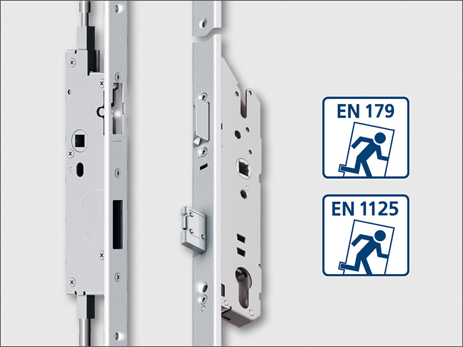 Aus der Serie der »DuoSecure«-Automatikverriegelungen stehen mit den Panikschlössern »autosafe 835P« und »autotronic 836P« zwei, gem. EN 1125 und EN 179, getestete Mehrfachverriegelungen für 1- oder 2- flügelige Fluchttüren zur Verfügung, geeignet für den Einsatz bei jedem Türenwerkstoff. Beide zeichnen sich ebenfalls durch die »DuoSecure«-Technik und die neuartige Riegelkombination aus. Die integrierte Panikfunktion ermöglicht eine sichere Flucht im Notfall. J